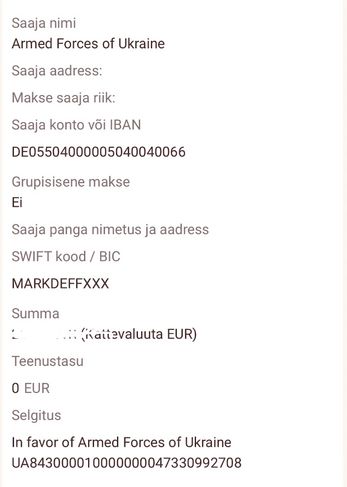 ja selgitusse: In favor of Armed Forces of Ukraine UA843000010000000047330992708