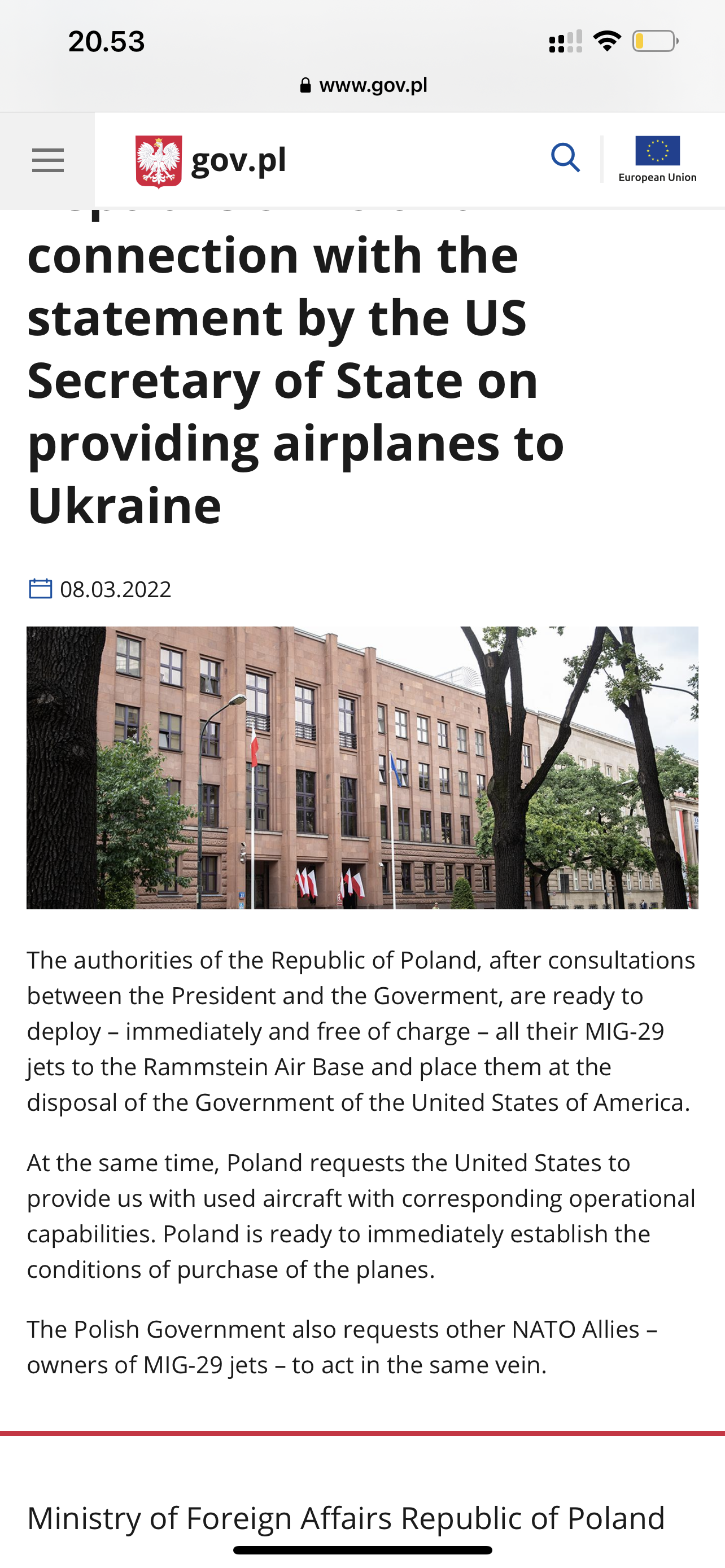 Poola vabariik otsustas kohe ja tasuta anda kõik oma MIG-29 lennukid USA-le ja viib need USA sõjaväebaasi Saksamaal Rammsteini. Poola valitsus palub samal ajal kõikidel oma NATO liikmetel, kellel on samuti MIG-29 lennukeid, anda needki samal kombel edasi USA kaudu Ukrainale.
