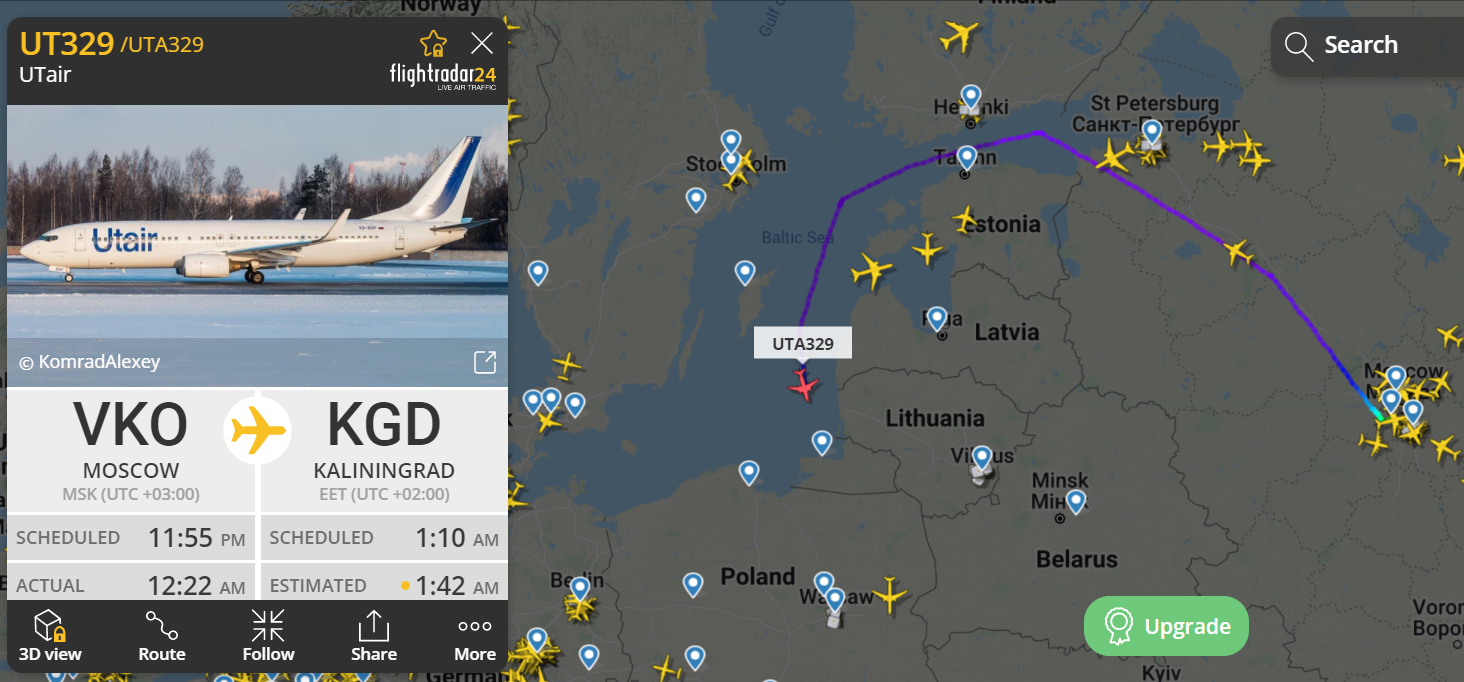 Lisaks on pilt sellest, millise teekonna peab vene lennuk läbima, et Moskvast Kaliningradi jõuda.