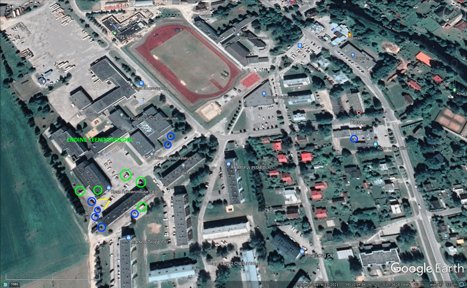 Panin pildi, kus on ventilatsiooniavad sinised, sisse- ja väljapääsud rohelised, Street View vaate suund kollane. Lisaks on pääsud Teeninduskoolis endas, üks näiteks oli lasketiirus märklaudade taga :).