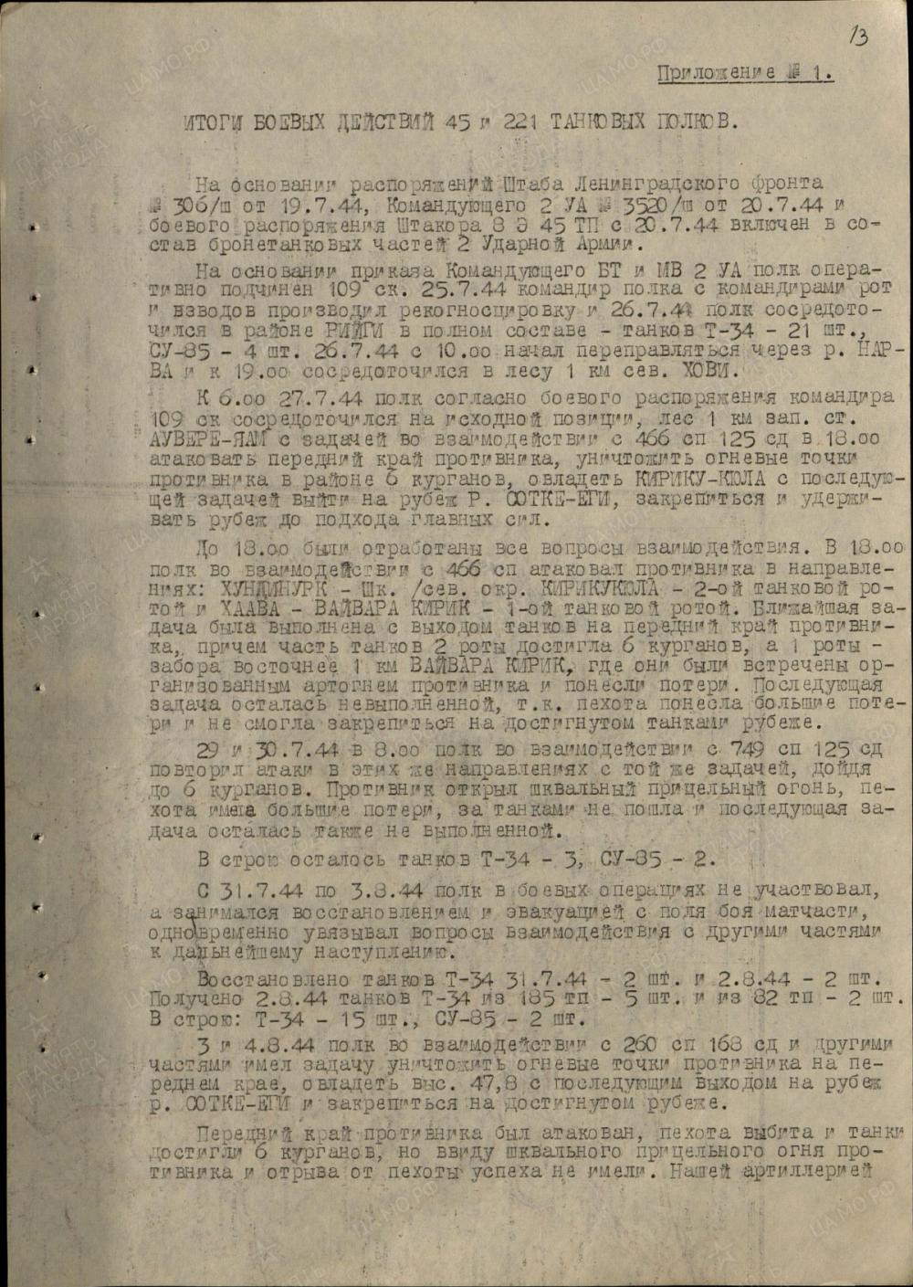 45. üksiku tankipolgu kasutamine Sinimägedes:
