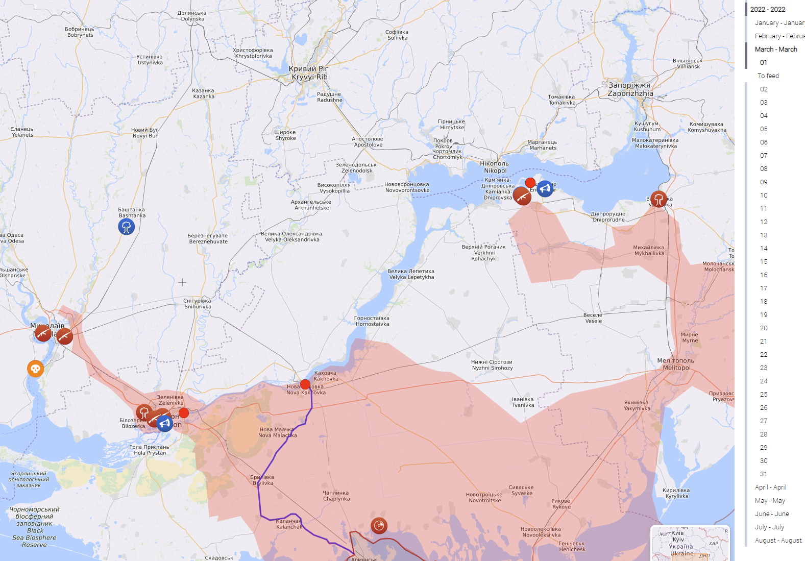 Nagu juba varem öeldud - samamoodi loovutati suur ala Dnepri vasakkaldal. Venelased lasid Vasilivka raudteesilla õhku 28.02 (veehoidla kagutipus siis, https://liveuamap.com/en/2022/1-march-t ... -bridge-in ) ning liveuamap.com värvib osa Vasilivkast punaseks juba 1.03. Sel hetkel oli kogu veel Ukraina valduses oelv Dnepri vasakkallas ära lõigatud. Läänes oli 1.03 juba Herson langenud ja vene üksused Nikolajevi all.