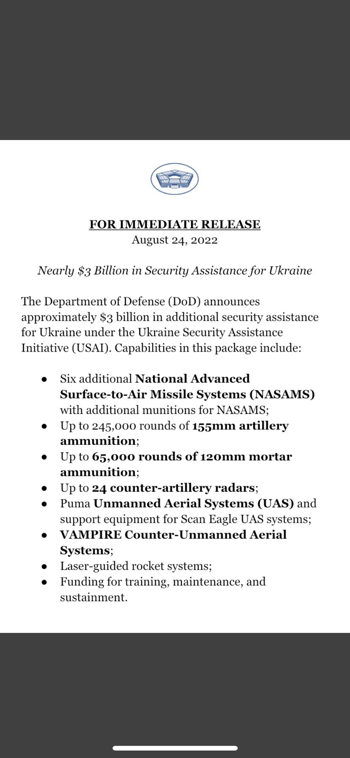 USA lubab homme, kui invasiooni algusest täitub 6 kuud ja on ka Ukraina iseseisvuspäev 3 miljardi dollari suurust abipaketti. Lisatakse, et see pakett