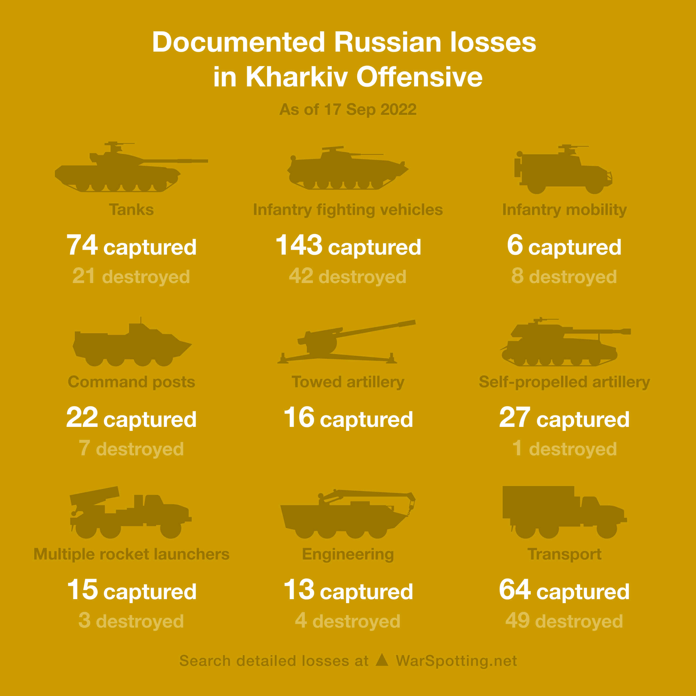 https://twitter.com/TrentTelenko/status ... 4538206209At a rough guess, Russia abandoned a mechanized division worth of fighting vehicles, a reinforcing brigade's worth of artillery, and between a fifth and a third of it's artillery shell reserves in Ukraine behind in the Kharkiv Oblast.