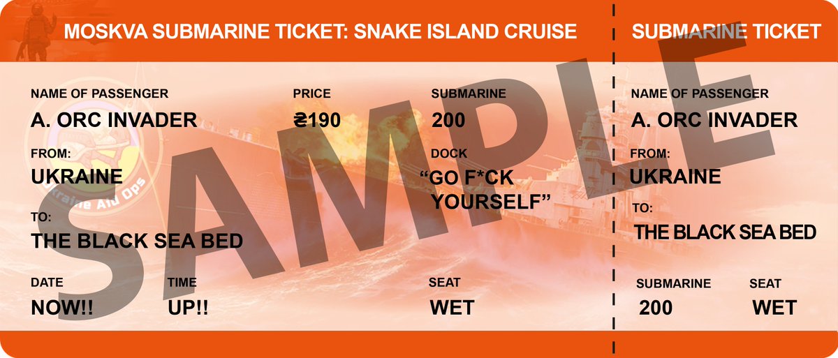 Molliraamatust leitud naljapilet okupantidele, et saaks need prussakad Ukrainast minema. Inglisekeelne tekst ka juurde-Our current fundraiser - help us kick the orcs out of Ukraine!