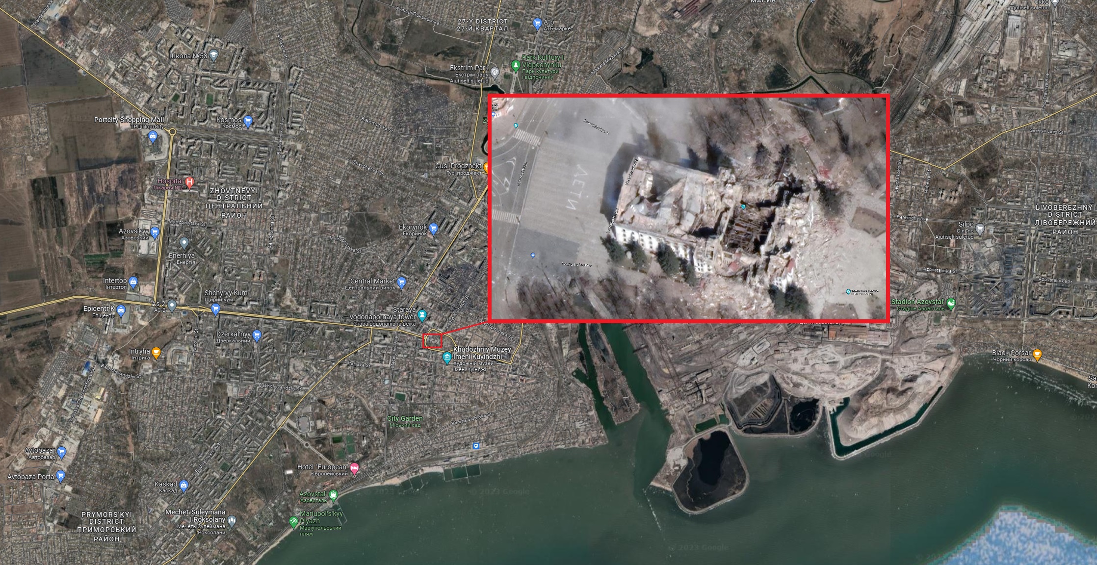Võta nüüd vaevaks ja vaata korralikult! Neil "uutel" 2023 piltidel on selle kuulsa purukspommitatud teatri ümbus kõik alles koristamata, aga 2022 aasta dets. alguses oli plats juba puhas ja tellingud katetega ümber. Samuti neil "uutel" piltidel selgelt näha mitmeid tossavaid-põlevaid hooneid. Jään oma seisukoha juurde.