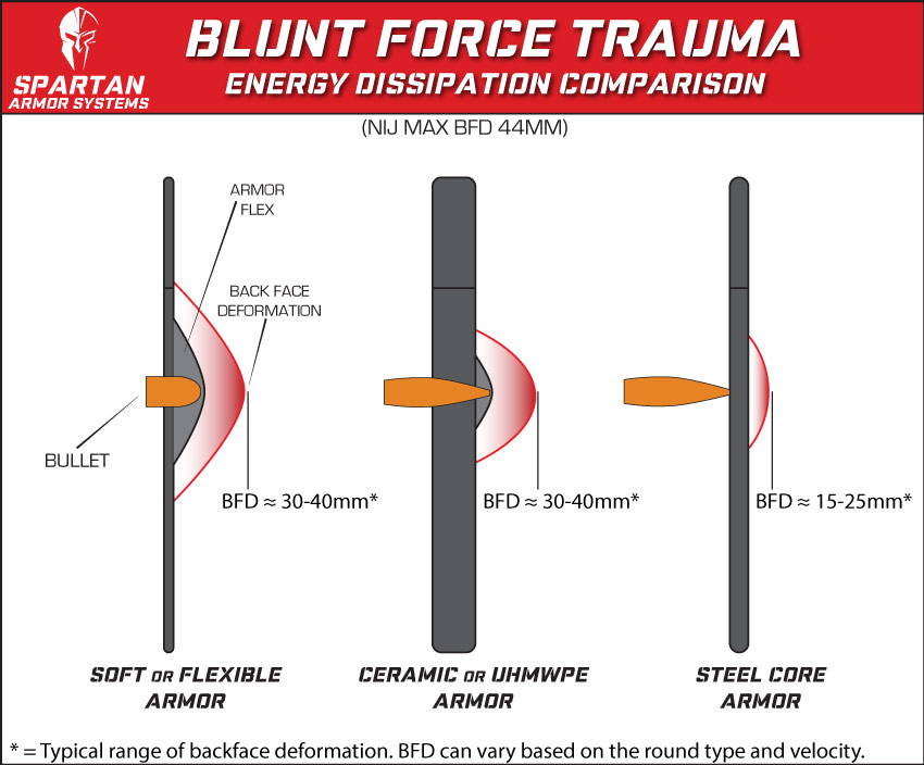 Reaalsuses näeb plaat pärast vintpüssist lastud kuuli tabamust välja nii nagu allolevatel piltidel näha. Seda traumat mõõdetakse nö ballistilise savi peal, mis siis peaks üsna lähedaselt kujutama inimkeha koostist. Ameeriklastel on see maksimaalne mulgustumine 44mm, Euroopas on karmimad nõuded, max on 20-25mm.