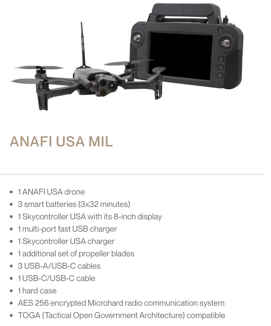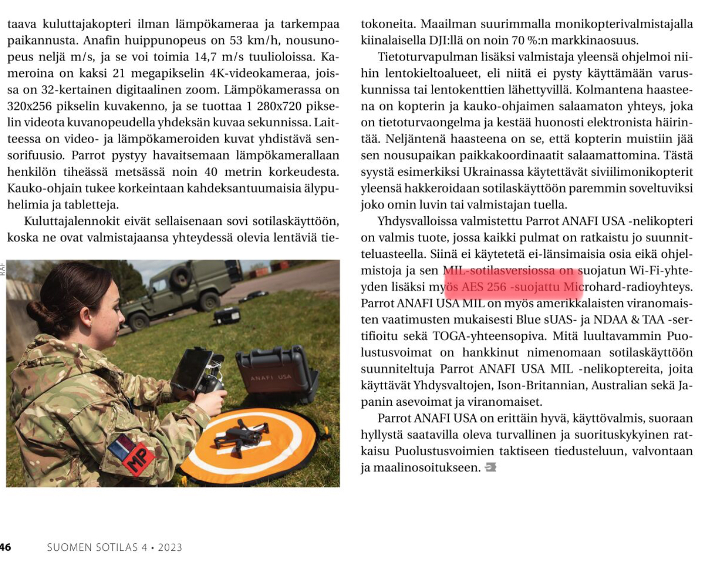 Soome kaitsejõududes algas ajateenijate väljaõpe Parrotitega 2023. aasta sügisel. Tehingu hind oli Suomen Sotilase järgi 2,3 miljonit USD. Kirjelduse järgi osteti vist mil versioon. Enne olid DJI Phantomid. Pikem artikkel maksumüüri taga https://suomensotilas.fi/Sakamoto kirjutas: ↑02 Mär, 2023 20:14mina loen siit välja, et teevad military versiooni samuti https://www.parrot.com/en/drones/anafi-usa/buyKilo Tango kirjutas: ↑02 Mär, 2023 16:07Kuna Parrotid on tsiviildroonid, siis neil ei pruugi see olla lahendatud piisavalt hästi militaarlahenduste jaoks.
