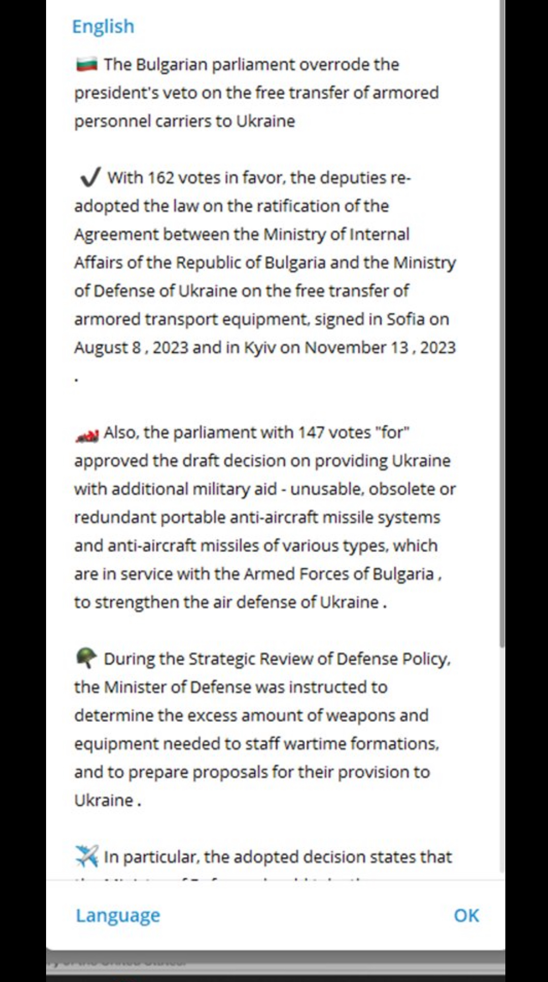 Bulgaaria ametivõimud kiitsid heaks vigaste MANPADS-ide ja muude erinevat tüüpi õhutõrjerakettide tarnimise Kiievile. Varem sügisel esitati riigi parlamendile seaduseelnõu mittetöötavate S-300 süsteemide üleandmise kohta Ukraina relvajõududele.