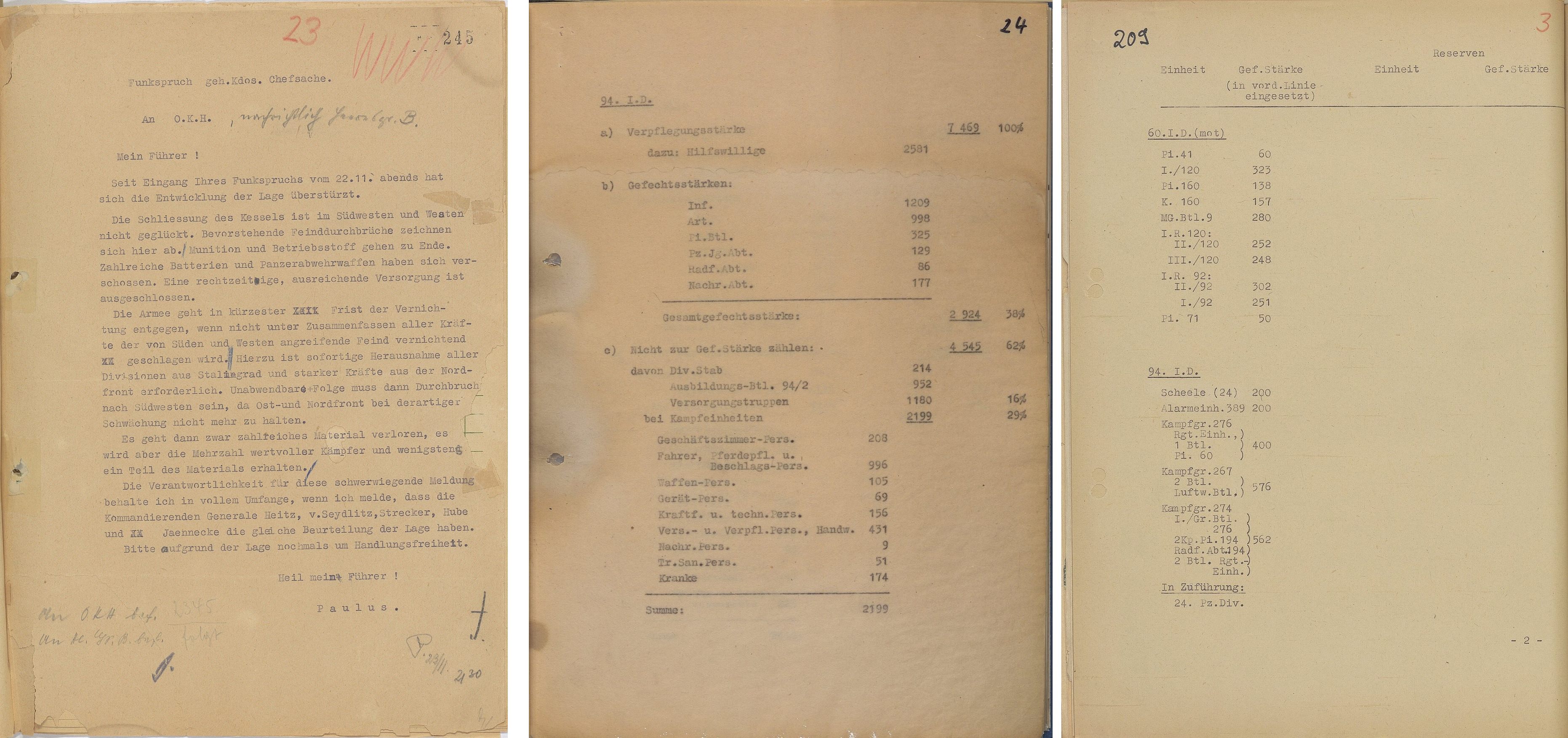 Tundub, et siia sobib lisada Pauluse 23.11 kiri Hitlerile, kus ta kirjeldas kohapealset situatsiooni, vajadust tuua väed Stalingradist ja põhjarindelt ära, et murda lõuna/edela suunas välja, lisas nimekirja temaga nõustuvatest juhtivatest kindralitest ja palus veel kord tegutsemisvabadust. (vasakpoolne)