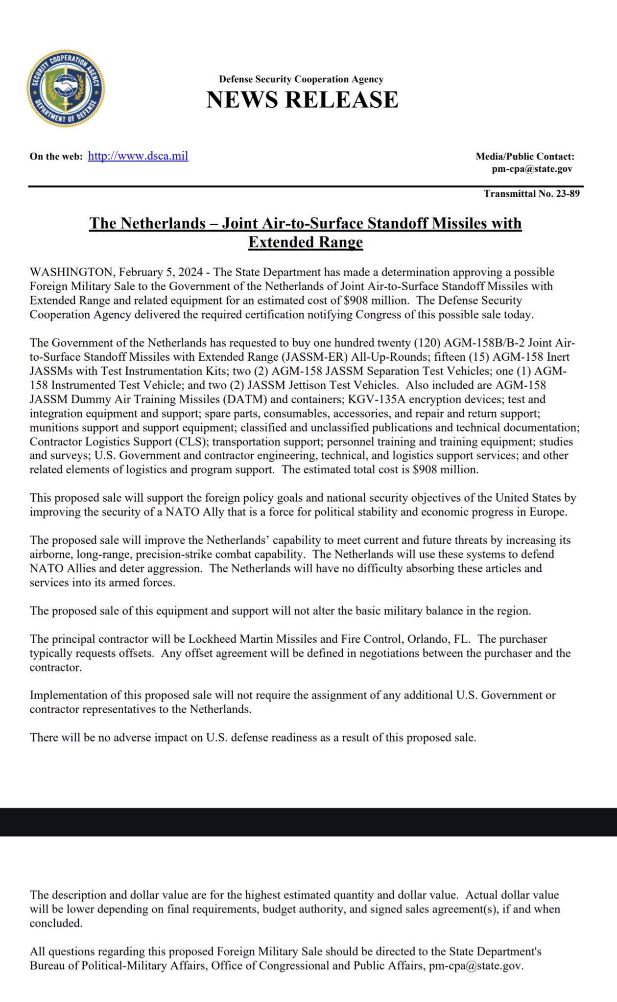 The US State Department has approved a Foreign Military Sale to the Netherlands of 120 AGM-158B/B-2 Joint Air-to-Surface Standoff Missiles with Extended Range (JASSM-ER), plus related equipment and services, for an estimated cost of $908 million. Lockheed Martin is the prime contractor.