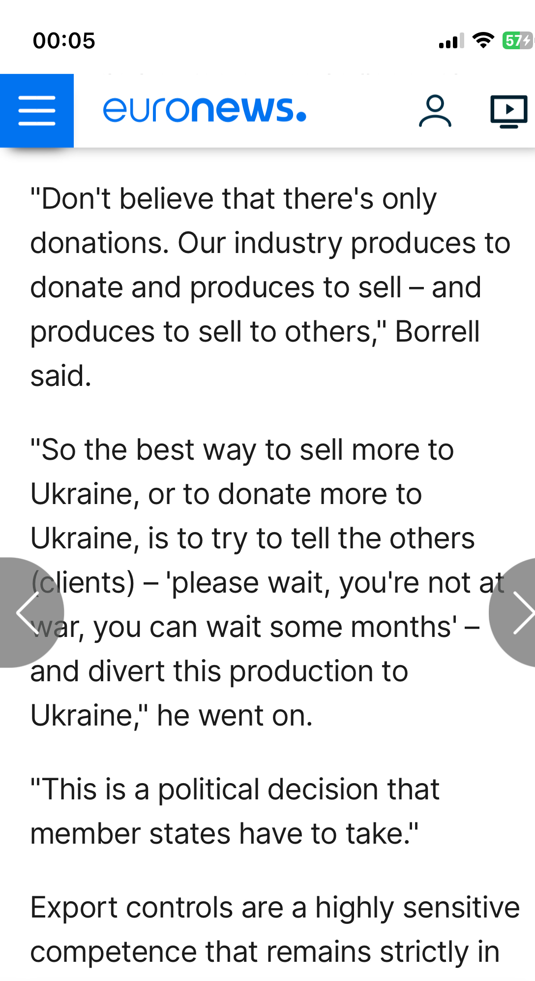 "EU did not fulfill the plan to supply Ukraine with artillery shells not because EU countries lack production capacity, but because they export shells to other countries", - Borrell