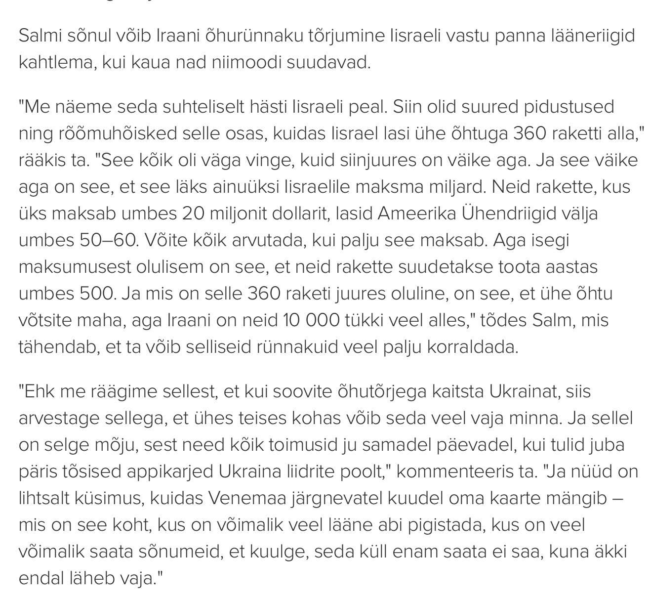 Ma loen 2024. aasta aprillikuus EV kaitseministeeriumi kantsleri intervjuud ja mulle ei jää muljet 1949, 1956 ja 1967 sõdade kirjeldusest. Jutt käib ikka väga kaasaegsest varustusest, millest Eesti õhutõrjujad vaid unistada võivad. Kantsler jättis targu kirjeldamata Iisreali snaipritäpsusega õhulöögi Iraanile kahe silma vahele ehk S-300 radari lõhkumise laskeseadeliste vahel olulise objekti juures, mis deeskaleeris kiirelt olukorra, sest juudid tõestasid, et aitab lja-lja-ljast ning järgmine pauk tuleb juba sinna kus päriselt vaja. Igasugune mõte jääda kinni 10 000 raketi peale puudub, kui loop keeratakse kiirelt sinu kahjuks sõjateatris. Siit kerkibki küsimus selle kohta mis meil endal olema peab (ja suudame riigina soetada ning üleval pidada) ja mis tuleb liitlastelt. Kas me peame Vene heidutamiseks ise tuumarelva soetama või usaldame NATO liikmena organisatsiooni heidutamise võimet. Ostame 15 päeva mürsud või 30 päeva varu või hävitajad koos ballistiliste rakettidega? Seda kõike peaks arvestama NATO salajased kaitseplaanid. Või mitte? Õnneks targemad kuskil ministeeriumites ja staapides teavad paremini millal rahandusminitril südamerabanduse nähud ilmnema hakkavad. Kuskil juba midagi käriseb https://www.postimees.ee/8004552/kapuli ... si-lukkama