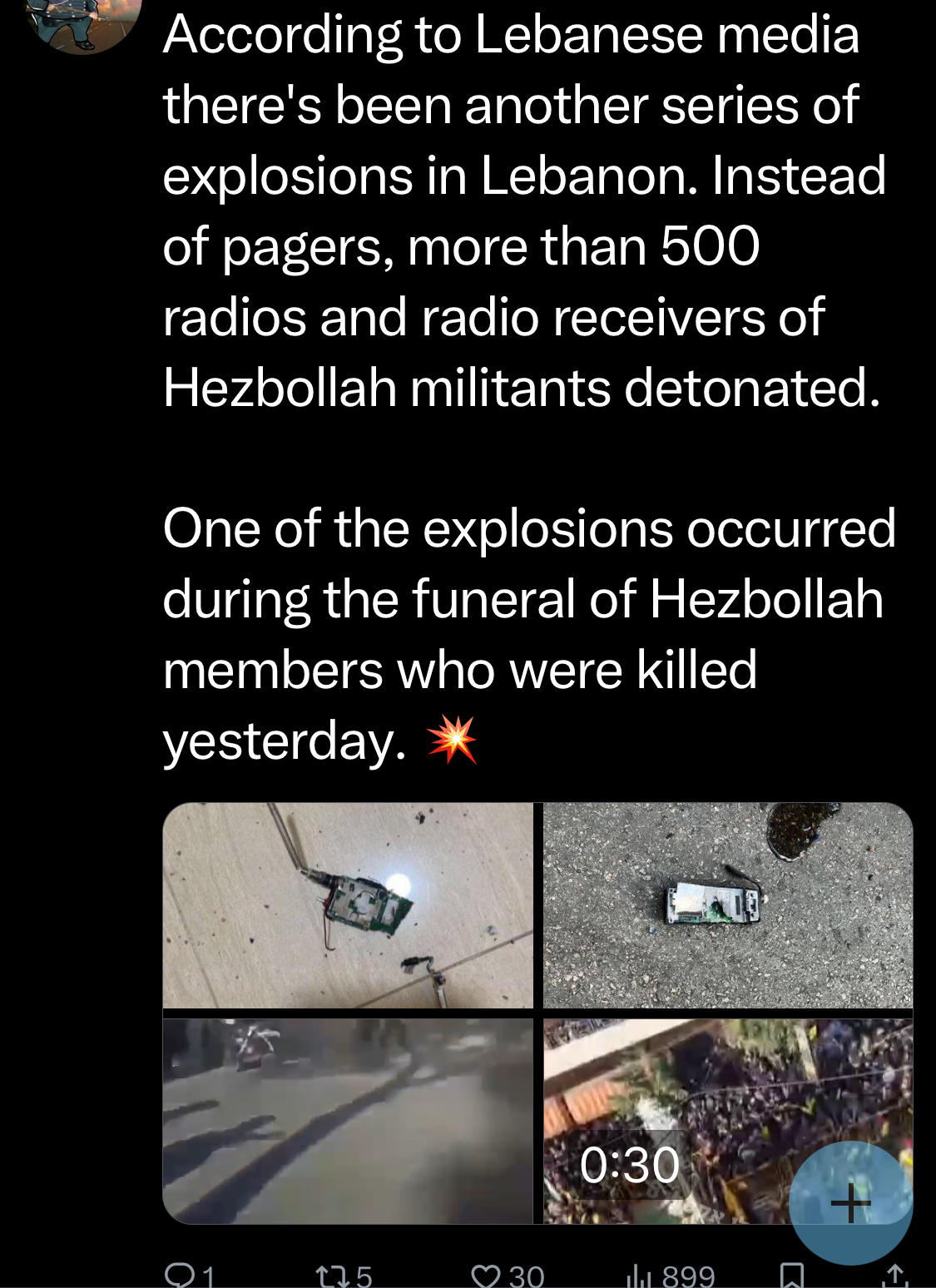 Aga noh vassimine, et surma sai 2 Hezbollah liiget ja vigastada 2900 süütut kõrvalseisjat pole kuigi usutav. Plahvatab see ikka Hezbollah mehe taskus või vööl, Hezbollah ohvrite arv on palju suurem, paljud "süütud kõrvalseisjad" on araabia spindoctorite väljamõeldis. Mossad suutis anda valusa laksu, lüües rivist välja sadu Hezbollah funktsionääre.