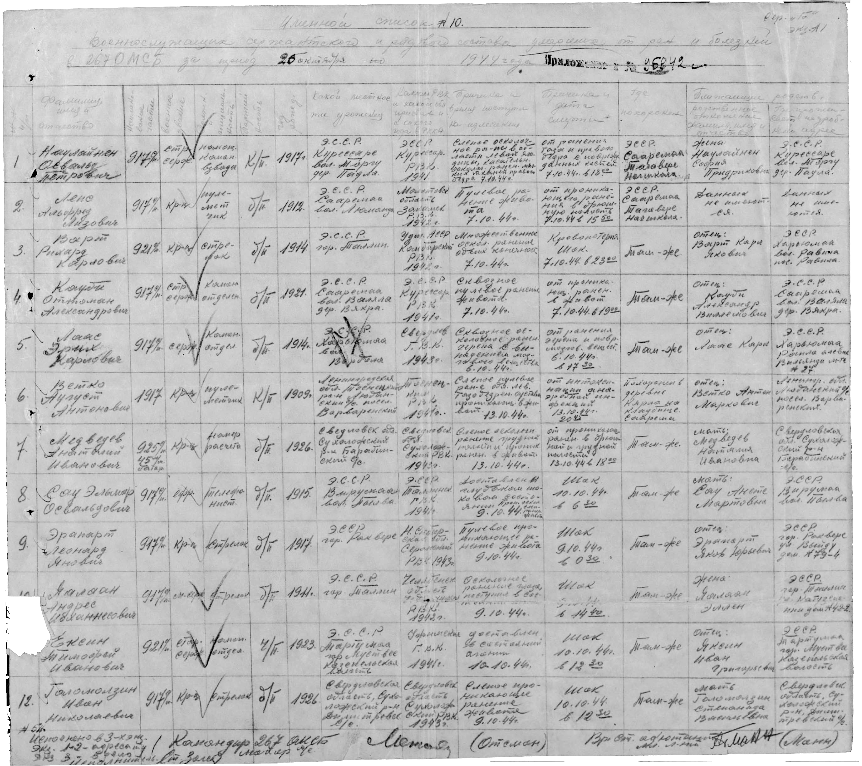 Военнослужащих сержансткого и рядового состава умершие от ран и болезний в 267. ОМСБ за период октября 1944г
