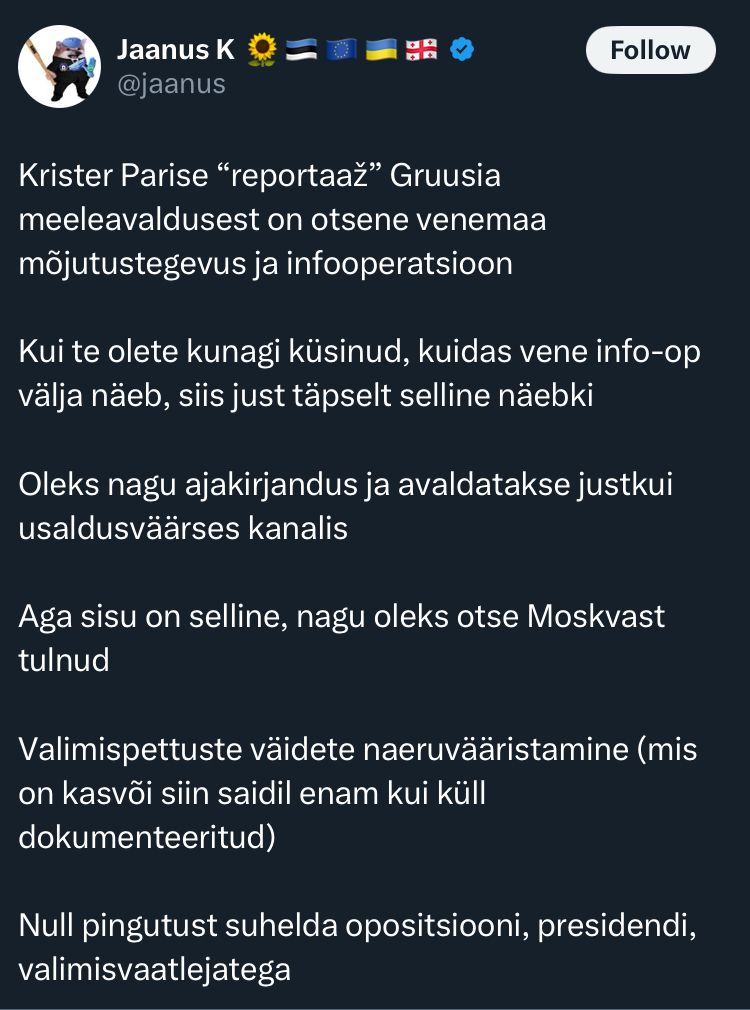 Kes vähegi Gruusia häälte jaotumist jälginud on, siis sobib siia teemasse hästi küll: