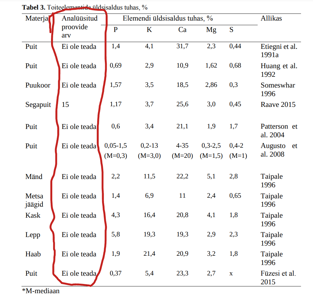 Siin on näha, et kui suures ulatuses on mõõdetud erinevate ainete sisalduse varieerumine ühe kolde kahes erinevas tuhaliigis, klodetuhas ja lendtuhas. Tuha sisalduse numbrite võrdlejatele teadmiseks, et katlamajade biokatelde koldetemperatuur ei tohi ületada +950C, sest siis suureneb NOx sisaldus suitsus.