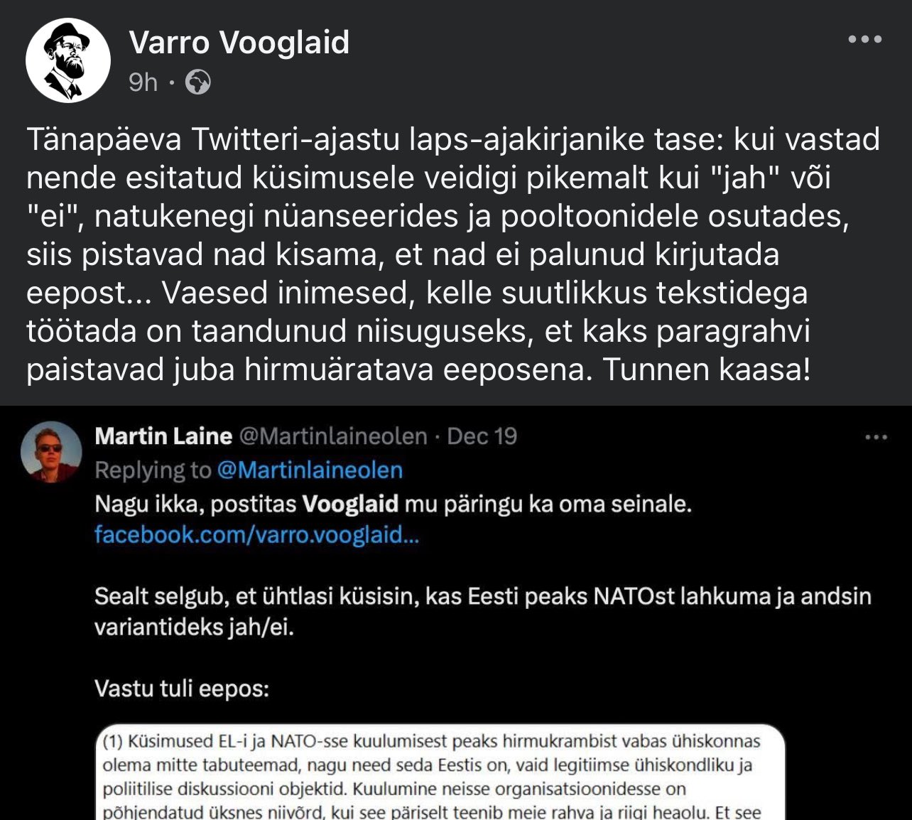 vooglaid kirjutas:Kuulumine neisse organisatsioonidesse on põhjendatud üksnes niivõrd, kui see päriselt teenib meie rahva ja riigi heaolu. Et see igal ajahetkel nii on, seda ei saa aksioomina eeldada.