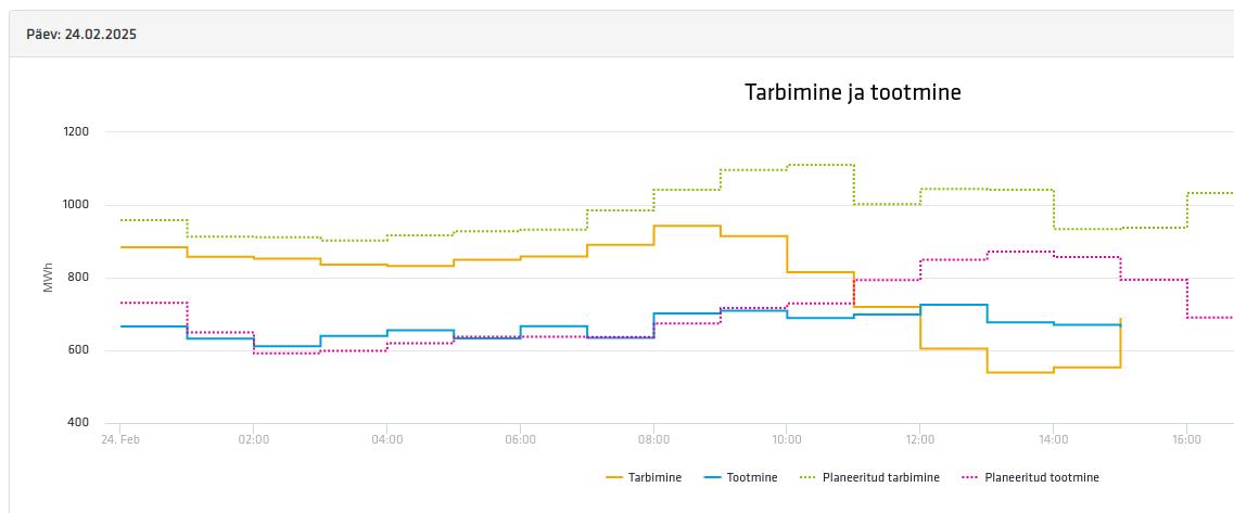 Tarbimine kukkus täna täiesti ära, kohati prognoosist 2x vähemaks. Kell 12-15 isegi tootmine ületas meil tarbimist mida ei ole juba aastaid juhtunud.