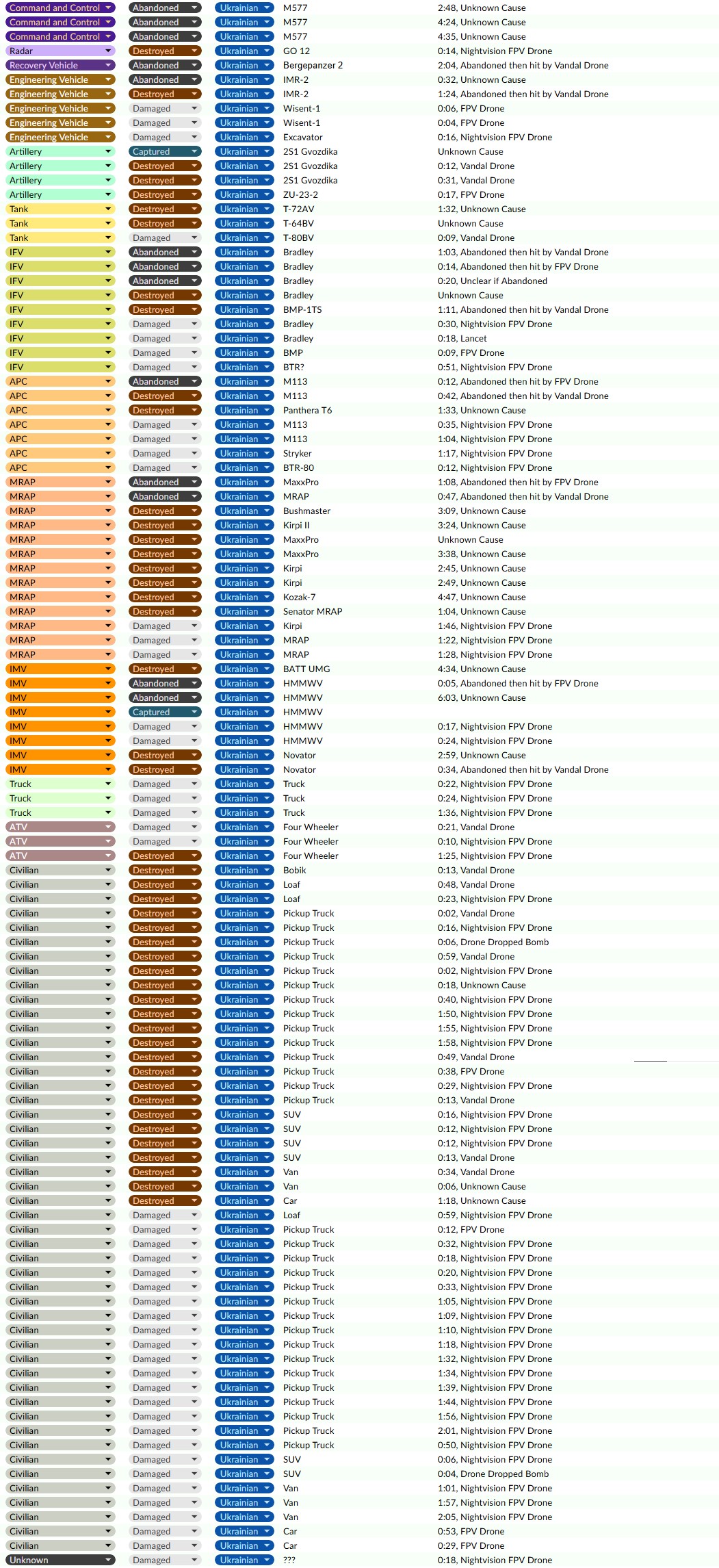 FPV droonioperaatorid hävitasid UR-77, Winsent 1MC IMR ja Bradley IFV. Teine Ameerika IFV lõhuti miiniga, kui ta üritas lahinguväljalt põgeneda.