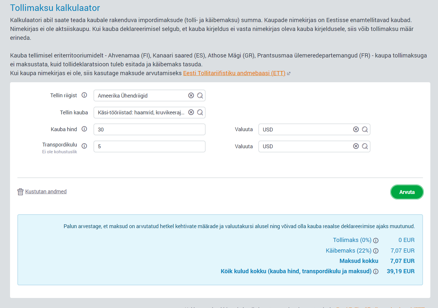 Ma jään selle leathermni arvutuse lihtsalt võlgu. Ma ei taha oma aega raisata EMTAs õigete tolliprotseduuride läbitegemise peale. Juba see näitab, et selle jubina tellimine pole seda vaeva ja raha väärt. Postifirmad pakuvad samuti lahtitollimist . Pole seda teenust kasutanud, aga vaevalt see alla 10 euro jääb. Puusalt pakun, et koos impordi ja käibemaksuga tuleb hind kokku ca 70 eurot.