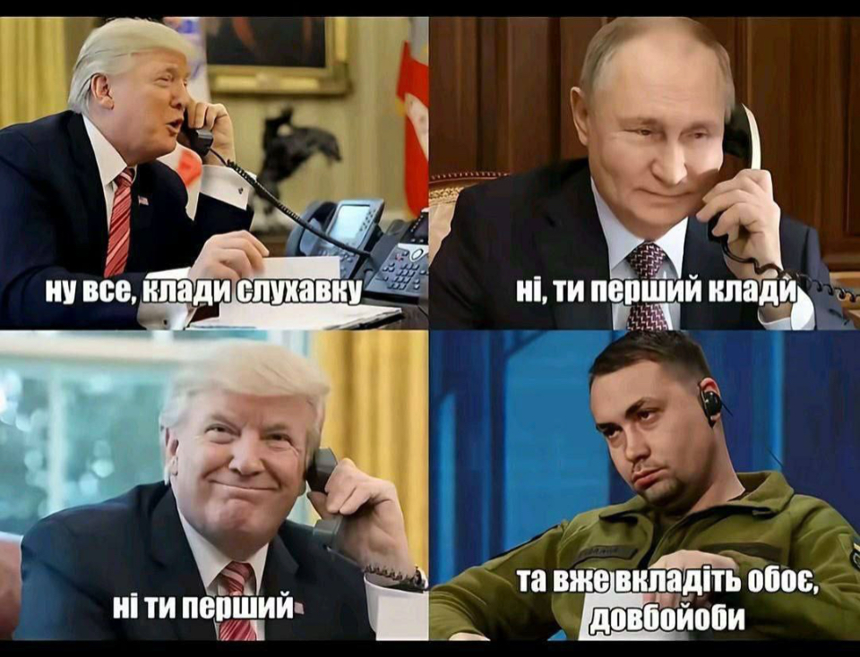 See on ukraina keeles. Aga tõlge on umbes selline, et trump ütleb, et pane toru ära palun ja putin ütleb, et sina esimesena ja trump uuesti et sina esimesena. Budanovi reaktsiooni mõtled vast ise välja juba...