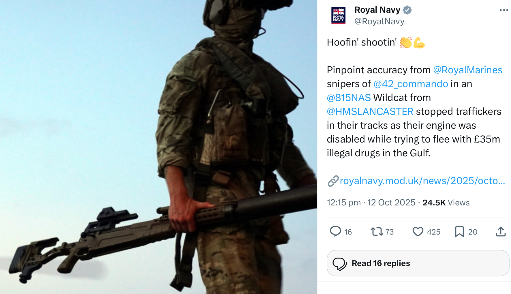 Siin uudises käib jutt ilmselt salakaubavedajate mootorpaadi peatamises mootorit puruks tulistades? See on üks koht, kus kindlasti suurest kaliibrist on kasu ja laskekaugused ei ole pikad, nii et kasutatakse ilma suurenduseta sihikut või väikest suurendust. USA rannakaitse kasutab näiteks poolautomaatset relva, sest tihtipeale 1 lasust ei piisa või mootorpaadil on mitu mootorit, mis on kõik vaja puruks lasta. Laevalt või helikopterilt täpselt tulistada on päris raske, sest mõlemad alused kõiguvad igas suunas. Kui on olemas stabiliseeritud aluse peal olev raskekuulipilduja või väikesekaliibriline kahur, mina eelistaksin seda täpsusrelvale.