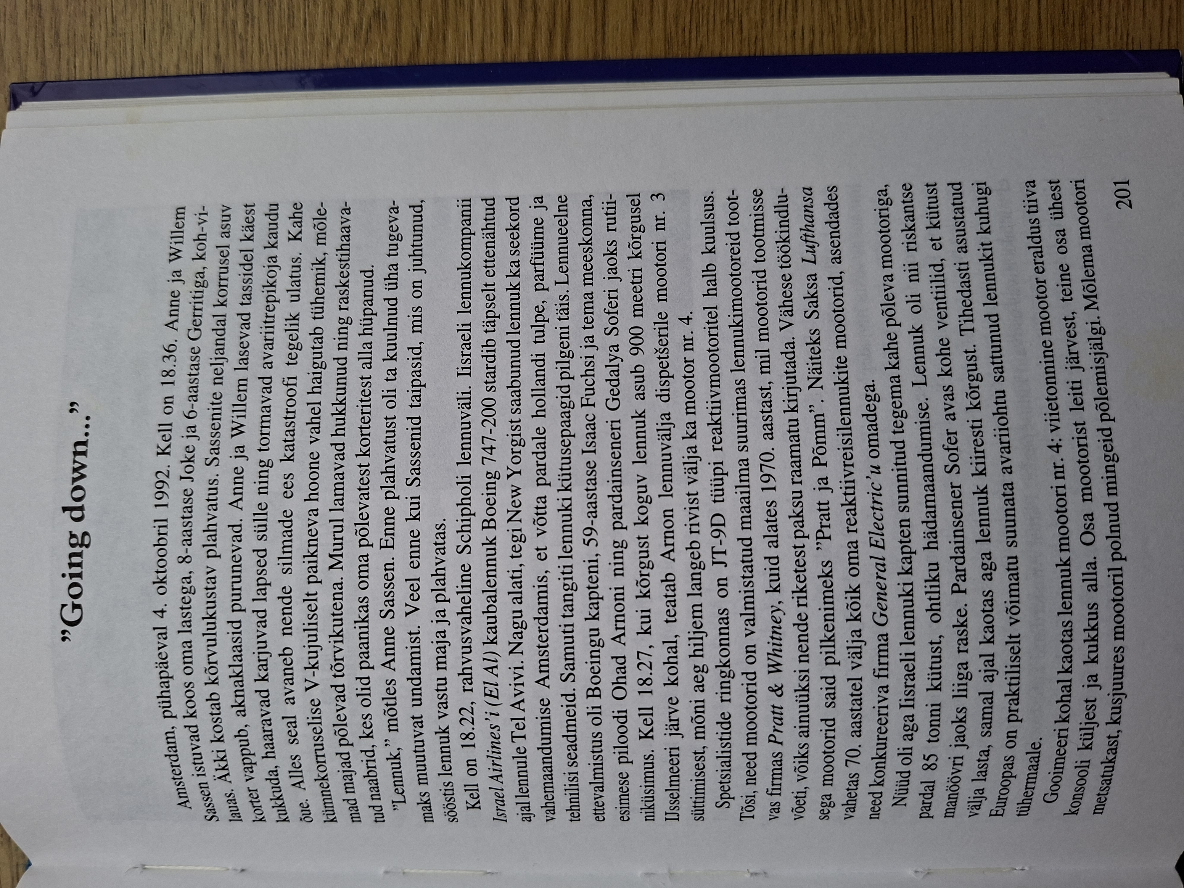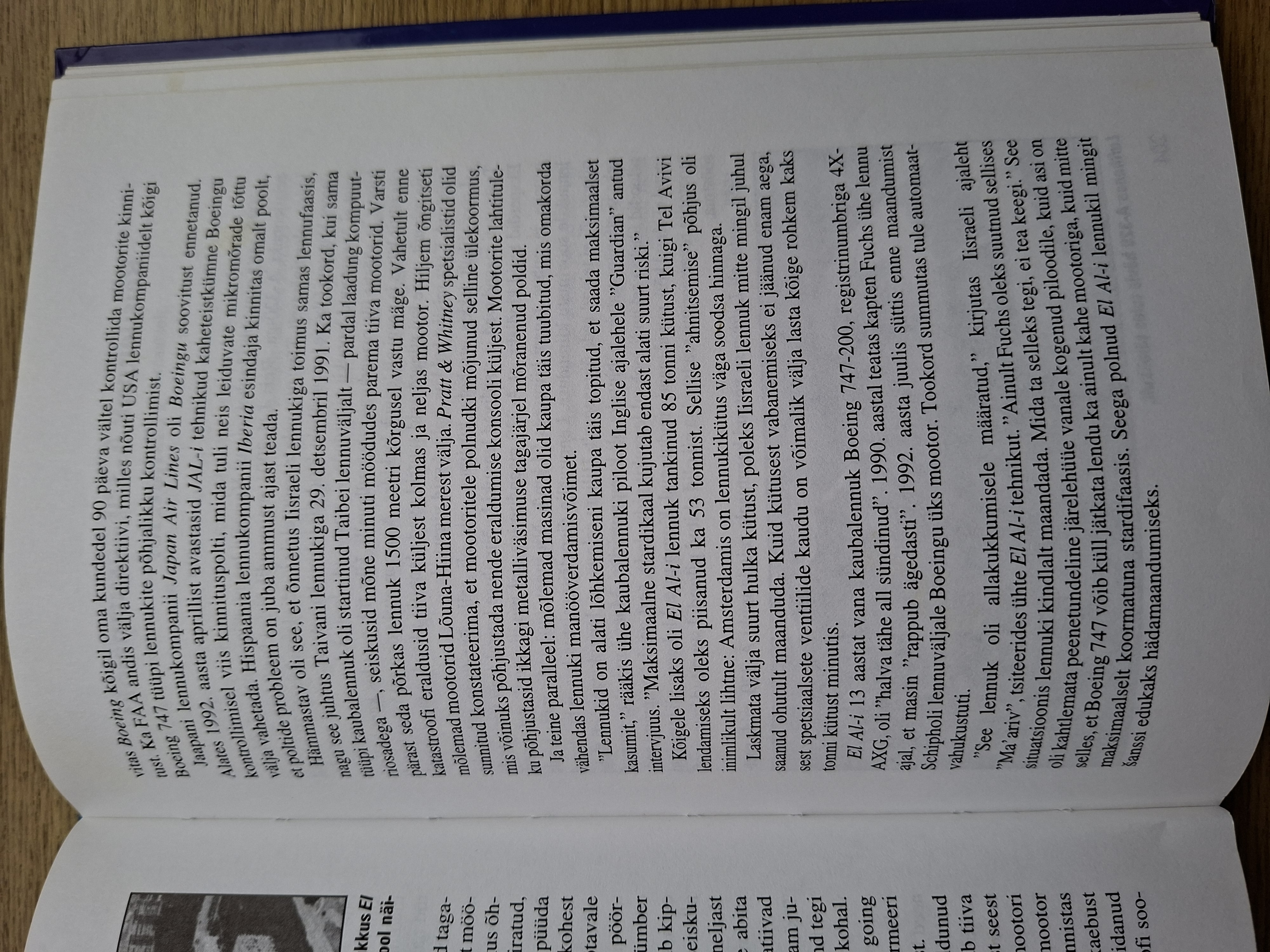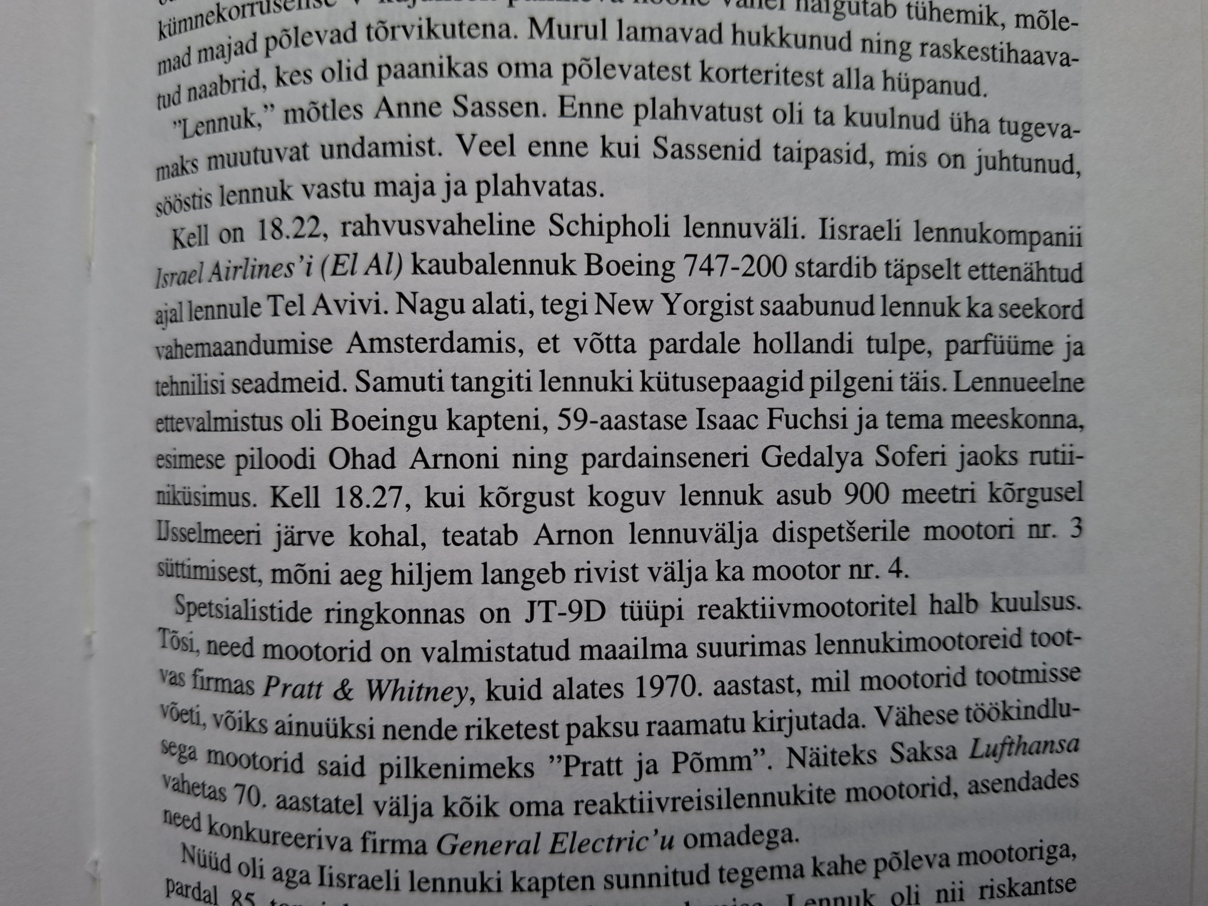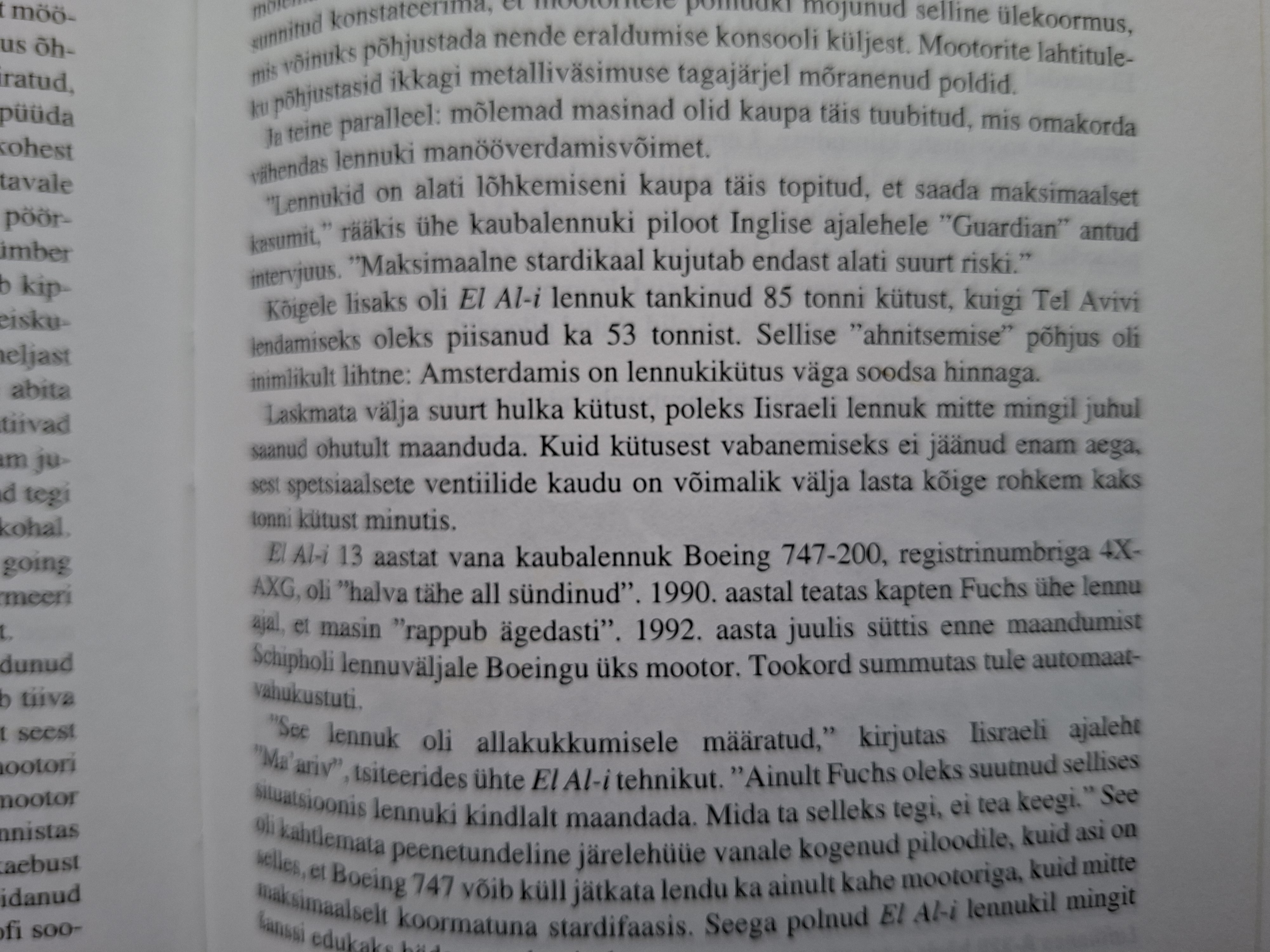 Oi-ei, asi polnud nii lihtne. See toimus stardi järel. Lennuk tangiti Amsterdamis silmini täis (soodne diil), võeti veel lillekaupasid juurde ja siis mindi maksimum stardikaalus Tel Avivi peale. Peale starti rebis õhus kaks mootorit küljest. Lõhkus ka muud ja viis rivist välja mitmeid süsteeme nii, et lennukit ei olnud võimalik enam kontrollida. Selle tagajärjel lennuk hakkas tegema Amsterdami kohal ringe ja järjest langema. Lõpuks tabas korterelamuid.paadikapten kirjutas: ↑07 Nov, 2025 2:32 Mootori eraldumine võib tiiba kahjustada. Kunagi Hollandis kukkus maanduv kaubalennuk sel põhjusel elumajja.