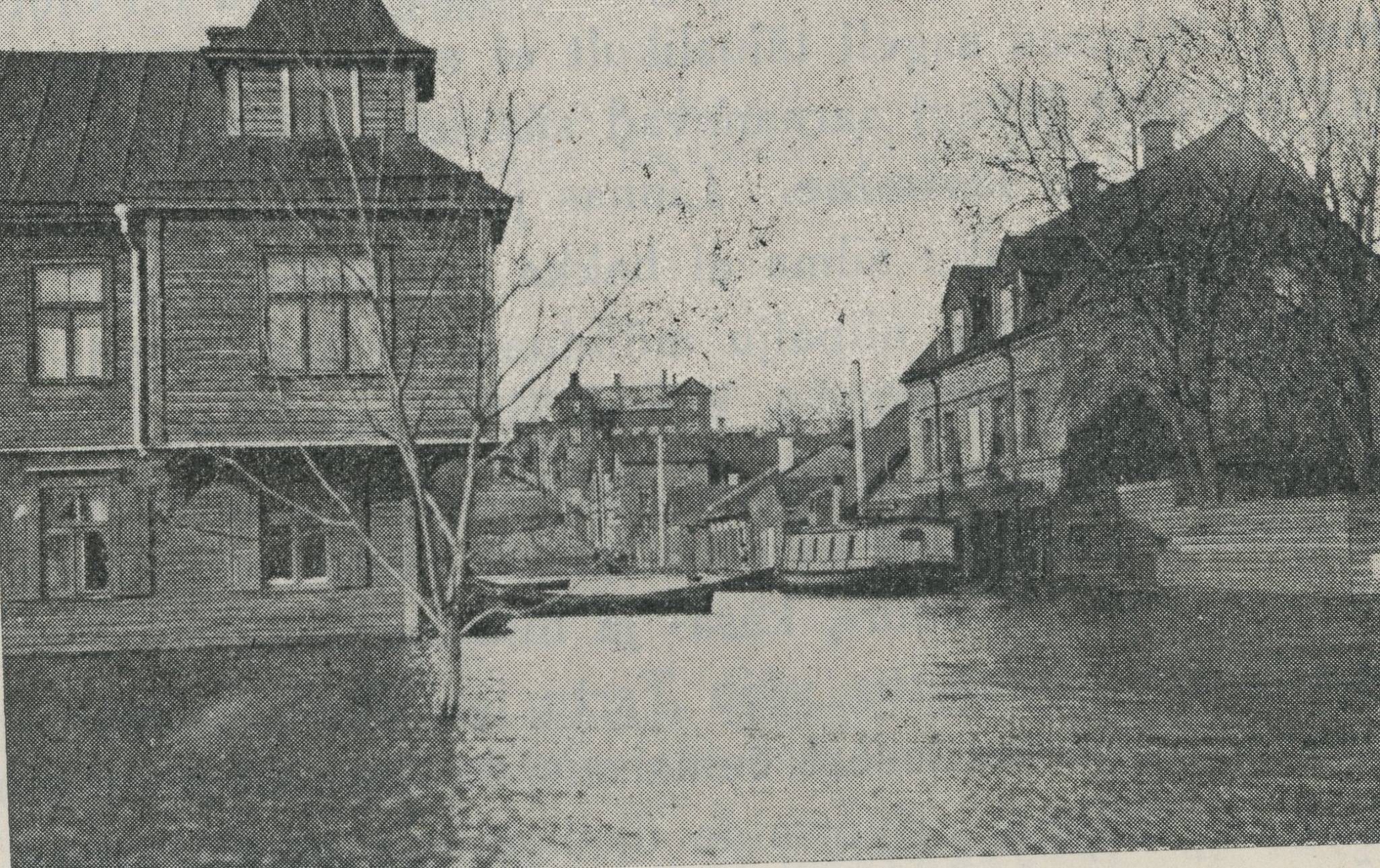 Mind huvitaks kõigepealt foto tegemise aeg. Olen seda ülesvõtet kusagil varem näinud ja meelde jäänud midagi 20-tega. Ülikõrgveeaastad olid 1922-24 ja 1926. See, et vesi sattus ka Liiva tänavale, on mittetavapärane, st pidi olema ikka absoluutne tipp. Kõige kõrgem veetase on olnud 1926. Ka 1923 oleks hädaga mõeldav. Teiste aastatega seal laevaga ringi ei sõidaks.