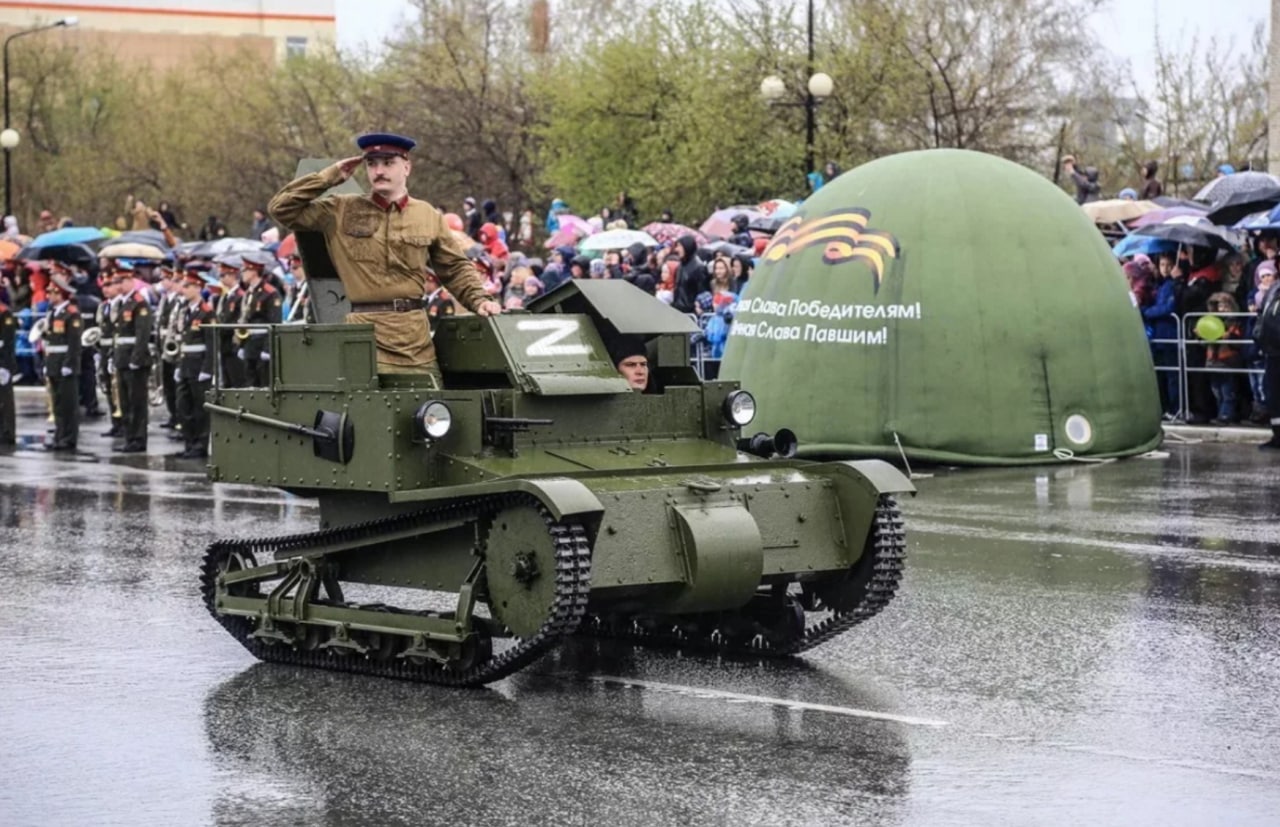 Et veelgi rõhutada ilmasõja ja tänase järjepidevust sõitis sõjatehnika kolonni eesotsas paraadi alguses Punasele väljakule II ilmasõja tuntud Vene tank T-34, millel lehvis punalipp. Seejärel alles tulid väeliikide ja üksuste lippudega kaasaegsed soomusmasinad. Seekord oli juba eelnevalt teada, et paraadi mastaap oli pisut kokku tõmmatud, sest nii mehi kui masinaid on vaja rohkem Ukraina vastu. Rõhku pandi lennumasinate ülelennule ja, nagu ikka, rakettidele.