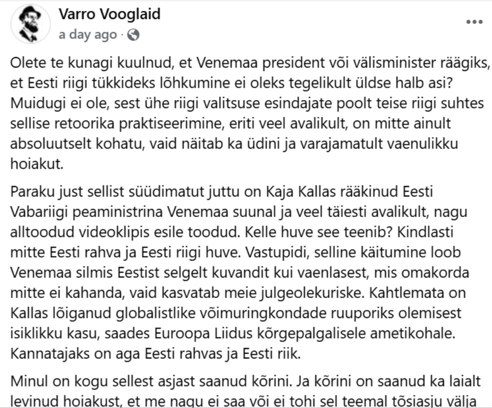 Autori märkus: Eesti kaitsevägi, näiteks sõjaväeluure, aitab juba praegu Ukrainat. See ei ole aga otsene sõjategevus. Kallas ei saanud ilmselt seetõttu jagada ka mingeid lubadusi Vooglaiu ette tsiteeritud jaburale sõnastuse peale. See ei tähenda, et oleme Venemaaga sõjas, nagu järeldab Vooglaid, ning millegi sellise väitmine olukorras, kus see paika ei pea, ei ole kuidagi Eesti huvides.