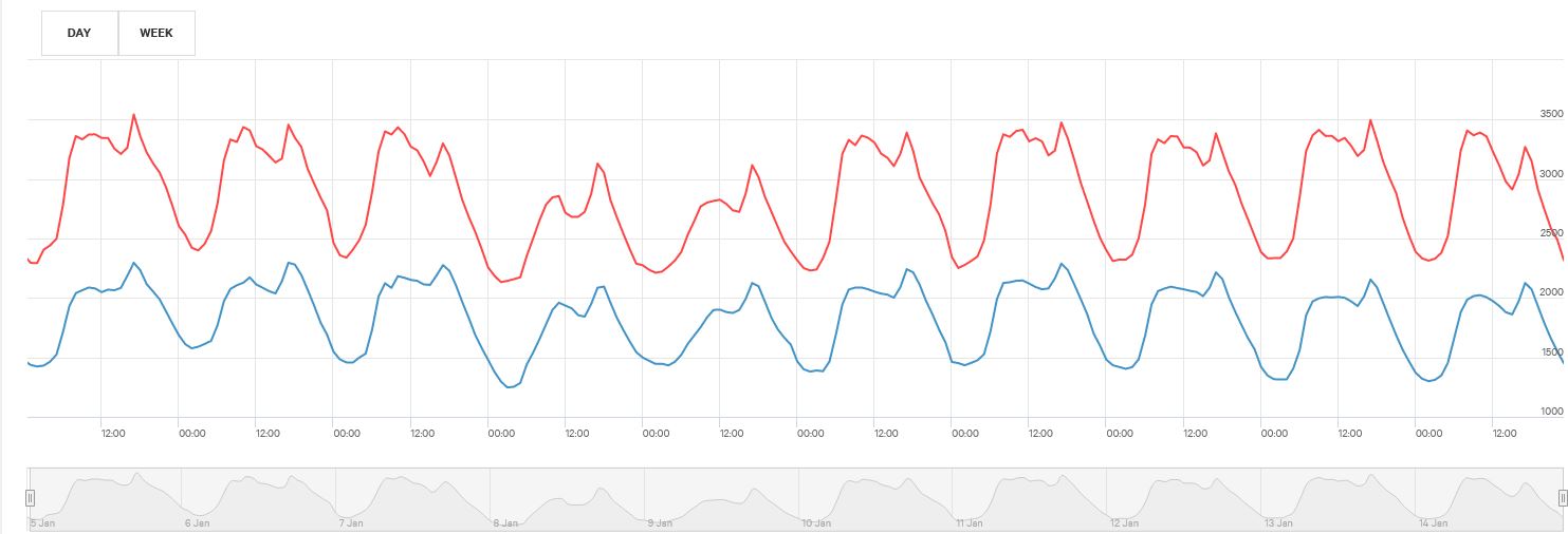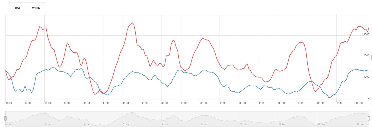 Nagu näha siis tarbine on tegelikult väga hästi prognoositav ja elektrijaamades saab toodangut hästi selle järgi reguleerida. Tuulega kahjuks on see jama, et küll on teda palju ja küll on teda jälle liiga vähe. Me ei saa vaadata börsil olevat hetke hinda.