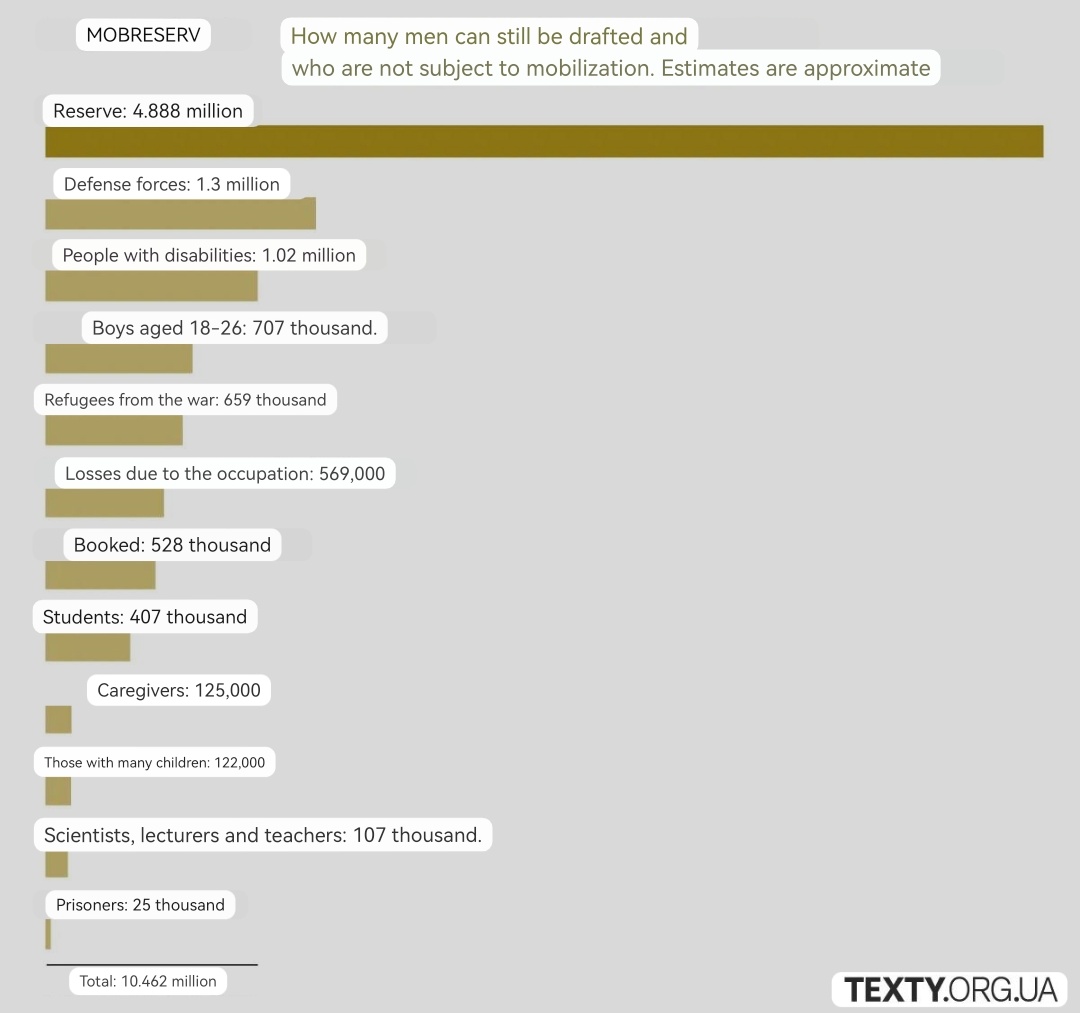 Ukrainlaste mobilisatsiooni reservi graafika. Sealt on näha, et ca 4,8M meeste maht on olemas. Mingi hetk oli parasiitide infoops nii suur, et erinevad väljaanded ja asjapulgad muudkui kurtsid, et reservi ja mehi pole ning maailm kukub kohe kokku.
