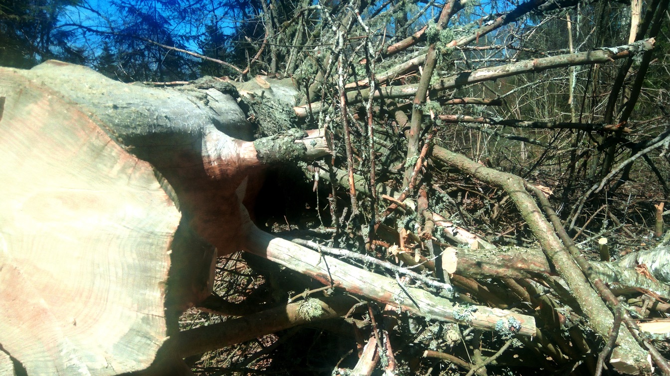 Kuusk muidugi võttis kukkudes maha ka ühe ca 20-25cm tüvega kase (pööras kummuli koos juuremättaga) ja hunniku sarapuid jms jama mis sai kohe alguses pakkudeks lastud ja mille lõhkumine kirvega oli lausa lust ja lillepidu - üks kõks ja pakk pooleks.