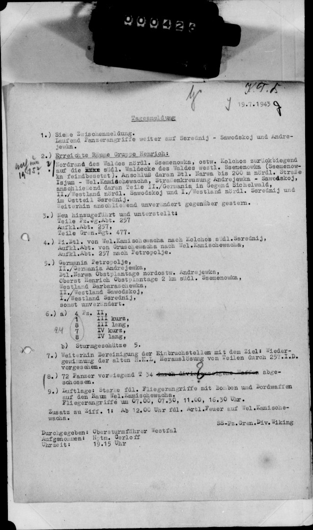 3.) 257. Inf.Div. wird mit allen Teilen ab 20.7., 17,00 Uhr, bis auf weiteres der SS-Pz.Gren.Div.Wiking unterstellt.