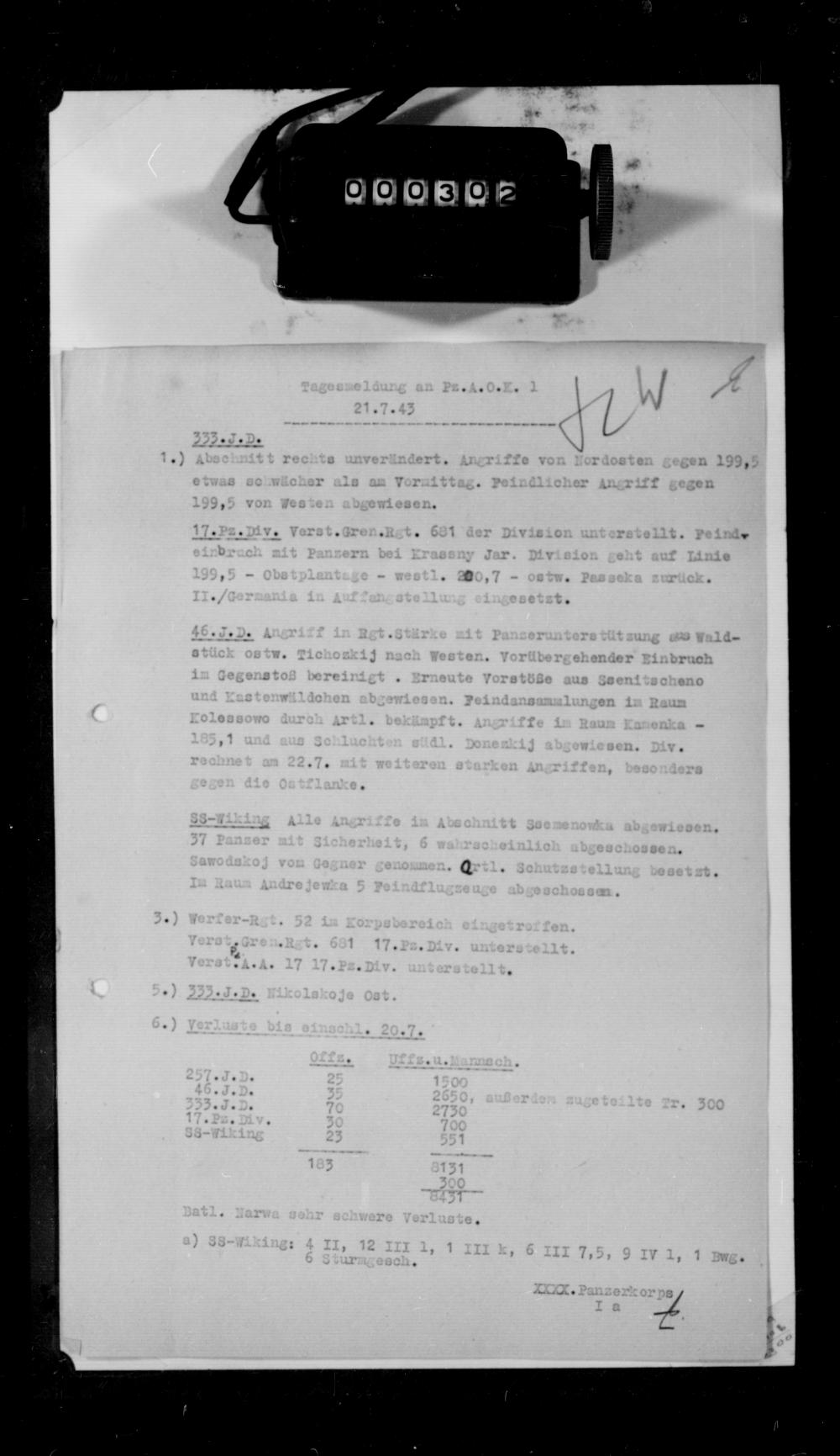 7.) Pz.Jg.Abt. Mensel ist bei einer etwaigen Abgabe des Befehls durch SS-Pz.Gren.Div.Wiking bei 257.I.D. zu belassen.