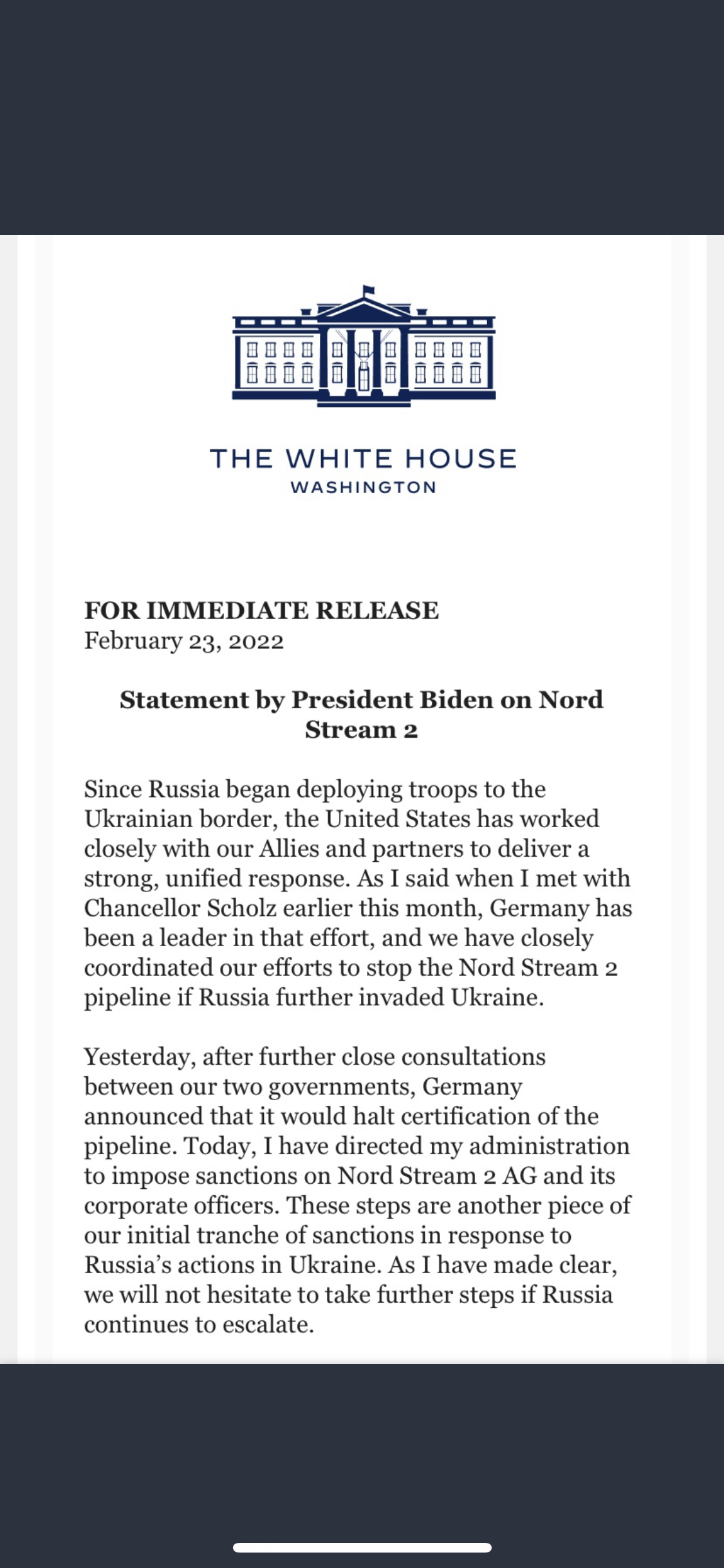 Saksamaa omakorda peatas Nord Stream 2 sertifitseerimise, USA kehtestas sanktsioonid kahe Venemaa panga, Venemaa riigivõla ja Venemaa eliidi vastu.