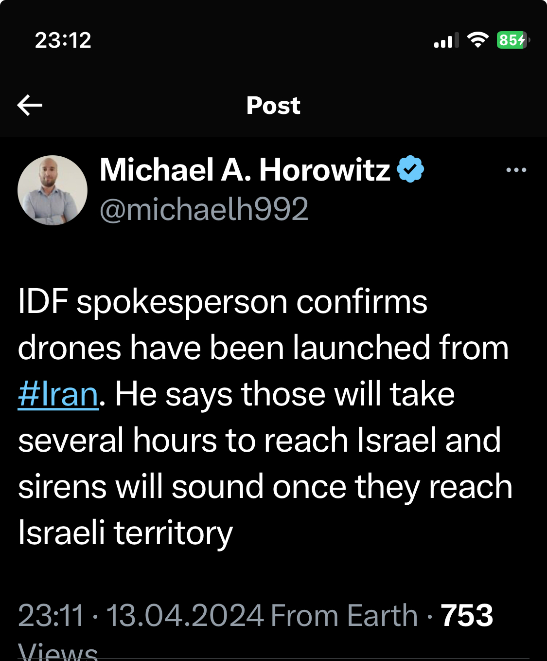 https://twitter.com/manniefabian/status ... 1207301280IDF Spokesman Rear Adm. Daniel Hagari announces new restrictions on civilian gatherings amid threats of an Iranian attack on Israel.