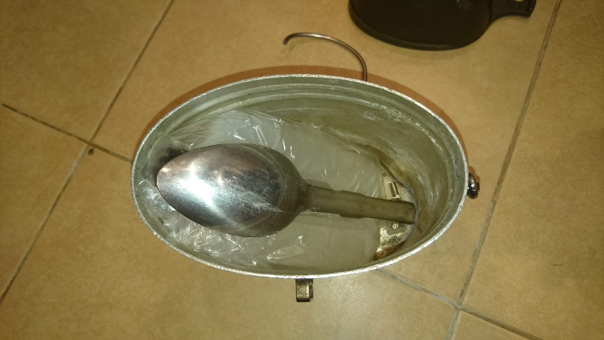 Kõigepealt tuleb panna katelokki piiritusepudel - soovitan panna kilekoti sisse, siis ei imbu piiritus katelokki. Seejärel tuleb panna katelokki noa-kahvli-lusika komplet ja joogitops. Esimestel proovimistel ei tarvitse kogu see kraam jääda õige nurga alla ja selle tõttu ei saa kaant peale panna, aga kui oled leidnud õige nurga, siis saab ka kaane peale panna. Kaas tuleb kergelt peale suruda ning sees olevad asjad jäävad surve alla ja selle tõttu ei kolise.