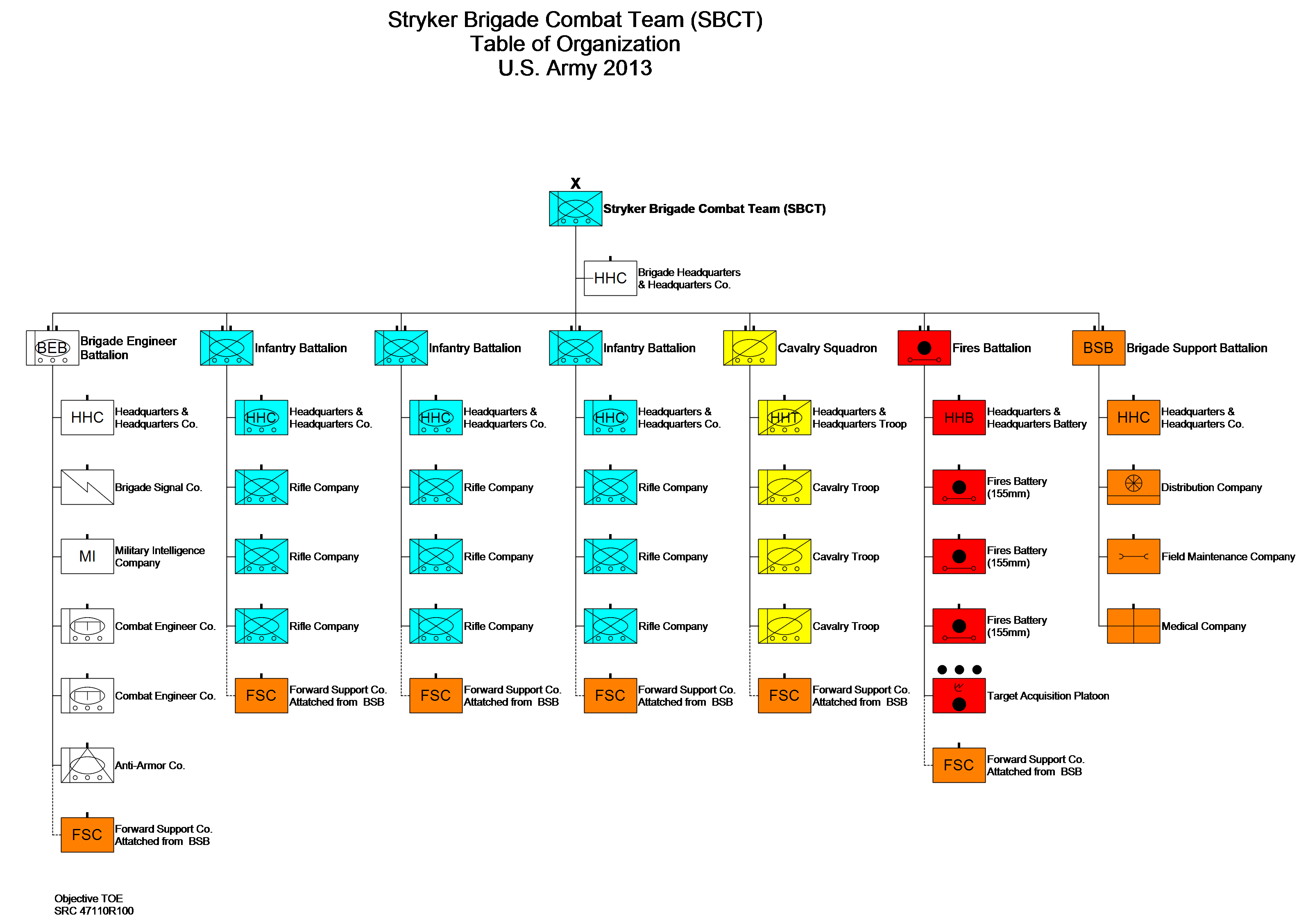Pataljone on sellises USA brigaadis seitse - millest üks on lahingujuhtimise (ja -tagamise) üksus, neli on käsitletavad manöövriüksustena, üks on lahingutoetuse- ja üks teenindustoetuse üksus. Ei ole muidugi teada, kuidas täpselt kavatsetakse seda brigaadivarustust kuue riigi vahel jagada, kuid ilmselt iga riik nii pataljoniportsu jagu varustust ladustamiseks ikka saab
