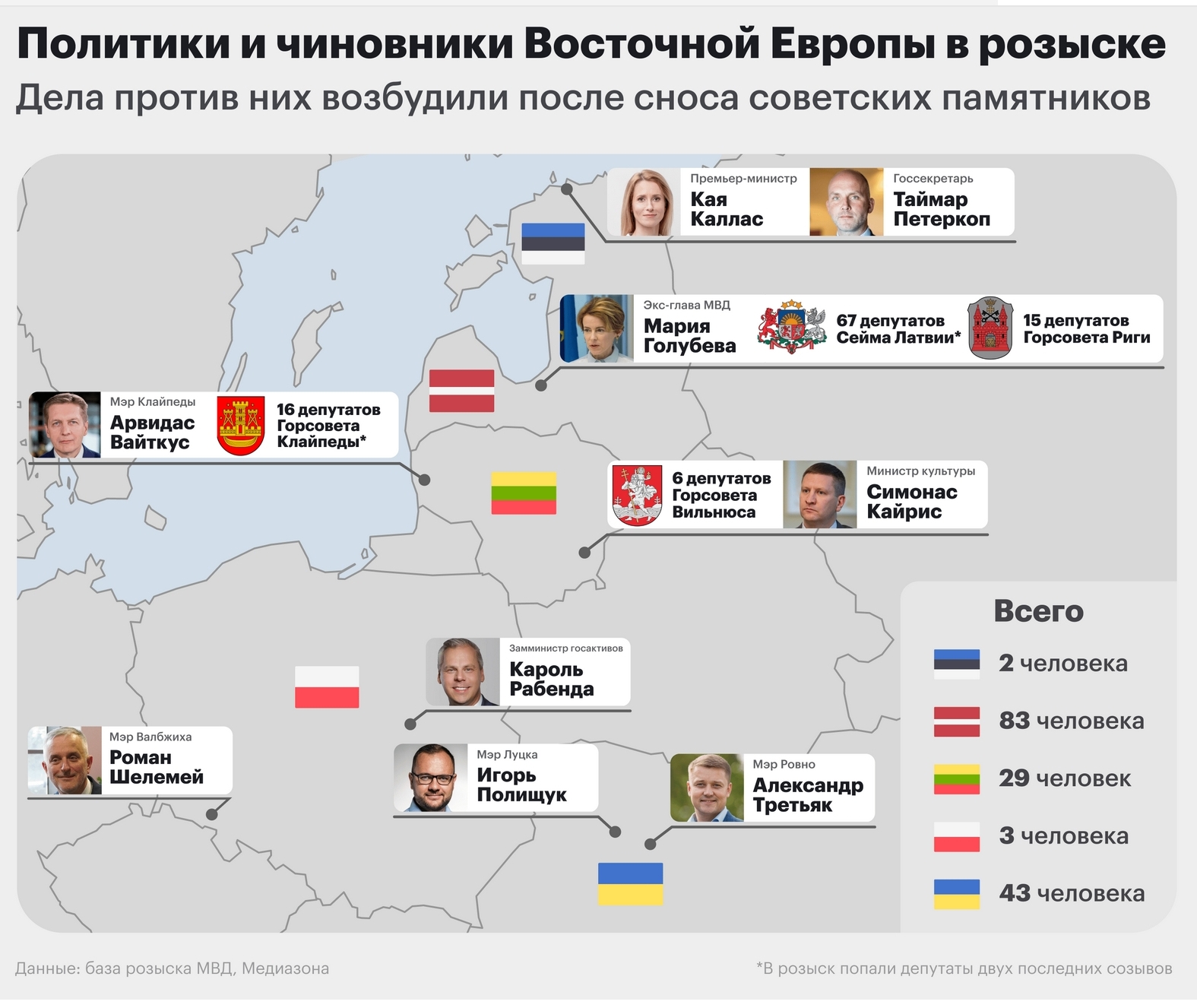 «Медиазона» собрала все карточки розыска из базы на сайте МВД и обнаружила, что Россия ищет по уголовным делам не только десятки политиков и чиновников из Европы, но и главу государства — премьер-министра Эстонии Каю Каллас. А также множество высокопоставленных украинских военных и сотни людей, которых следователи считают «иностранными наемниками» в рядах ВСУ. Для всех любопытных — удобный поиск по базе МВД (можно поискать себя, однофамильца или любого, кто взбредет вам в голову).