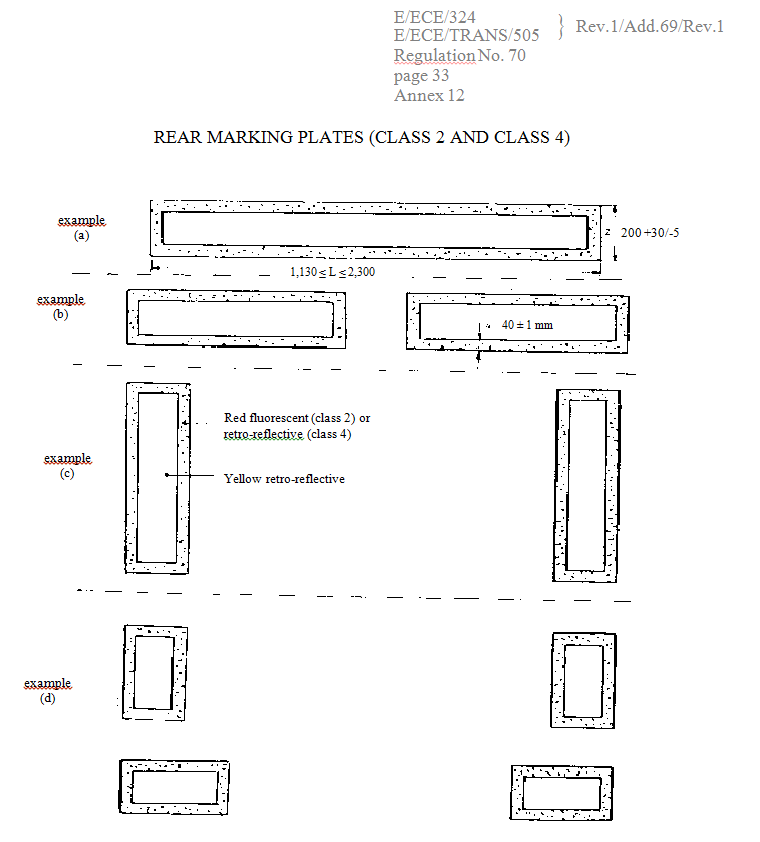 Class 2: Rear marking plates for long vehicles (trailers and semi-trailers) with red fluorescent border and yellow retro-reflective centre.