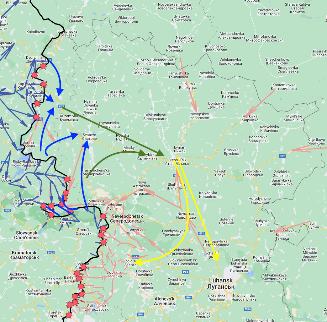 Poliitiliselt pakuks muidugi enim kõneainet suund Lisišansk ja Severdonetsk, kuid mulle tunduks kaugelt mõtekam hoopis halvemini kaitstava põhja Luhanski vabastamine ehk suund Svatove ja Starobilsk. Troitske või Bilokurakyne jms kaugemad asulad oleks muidugi tore lisaboonus, aga ei tundu jälle hädavajalik (Starobilskist tegelikult piidab et viimanegi ühe rõõpapaariga raudtee Luhanskisse ära lõigata, teised kaks teeks seda lihtsalt piirile lähemalt).