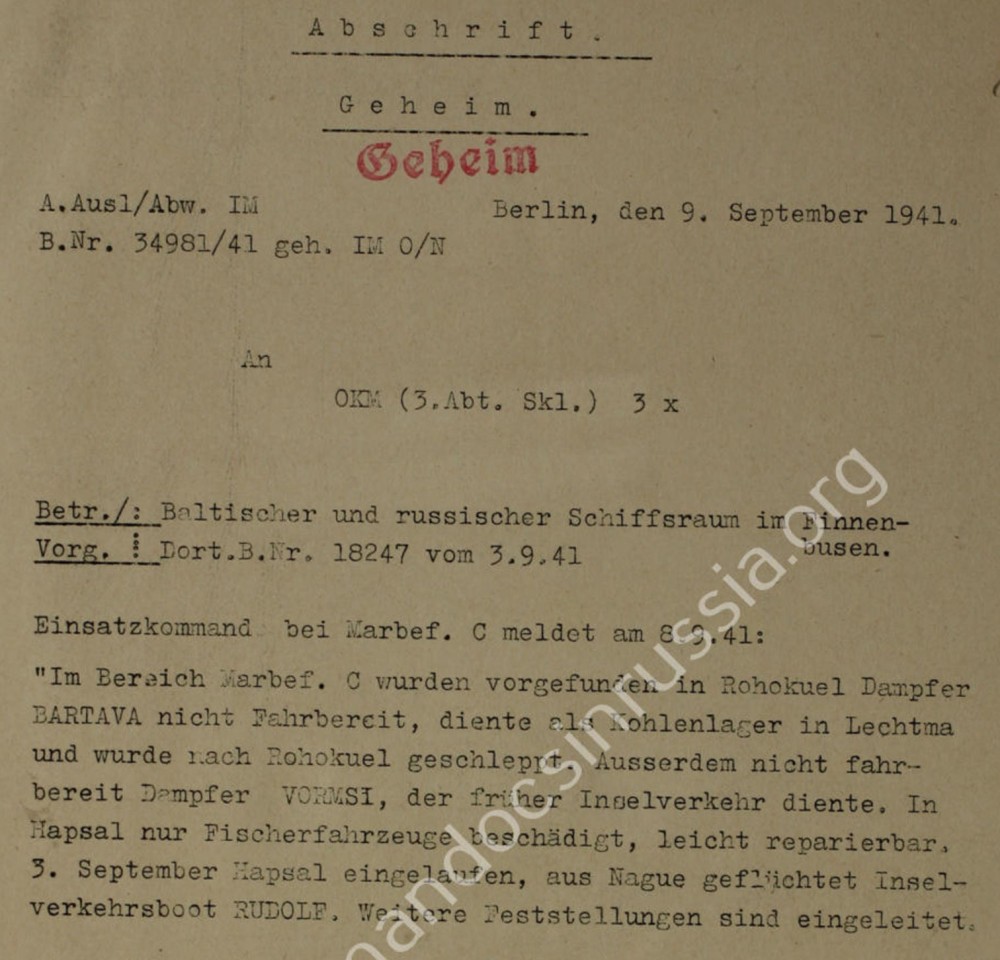 Marbef.C kirjutas:Erkundungsergebnis Hapsal und Rohukuela. [...] Rohukuela an Mittelmole Nordseite etwa 4 Südseite etwa 5 m tief. Sämtl. Gebäude zerst. Lt. Dpfr. „Bartawa“ ca. 500 to. leer, mit Bombentreffer und ein kleiner Verkehrsdpfr. anscheinend unbrauchbar. Keine Fischerboote.