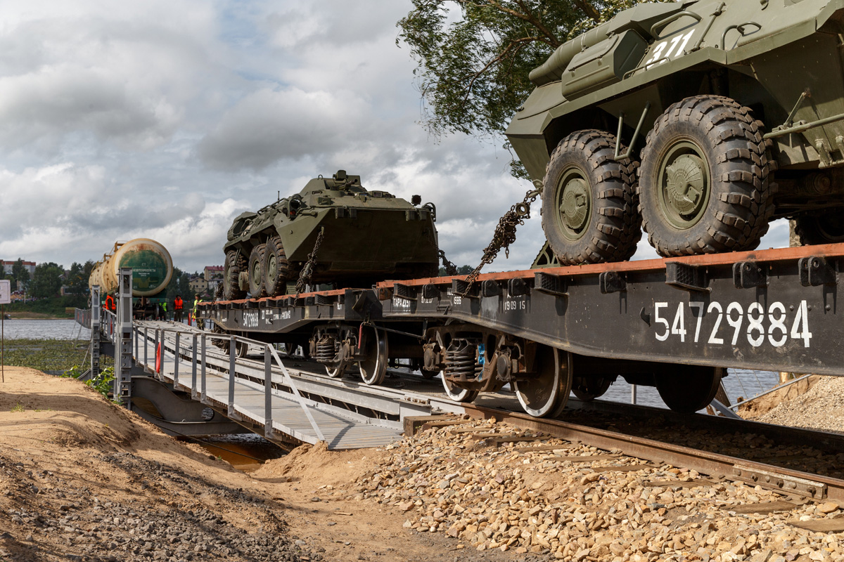 Rus & Belarus exercise:2x 2S19 Msta-S atop a rail car crossing NZhM-56 pontoon bridge;BREM-L & BREM-K recov.vehicles