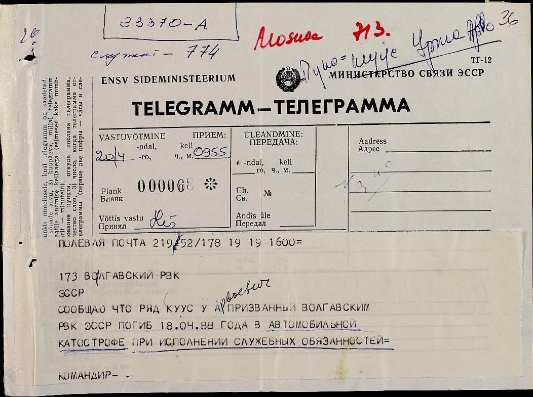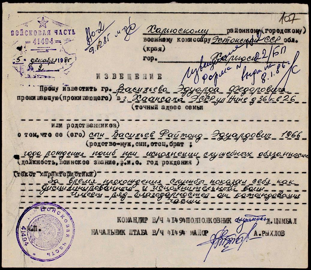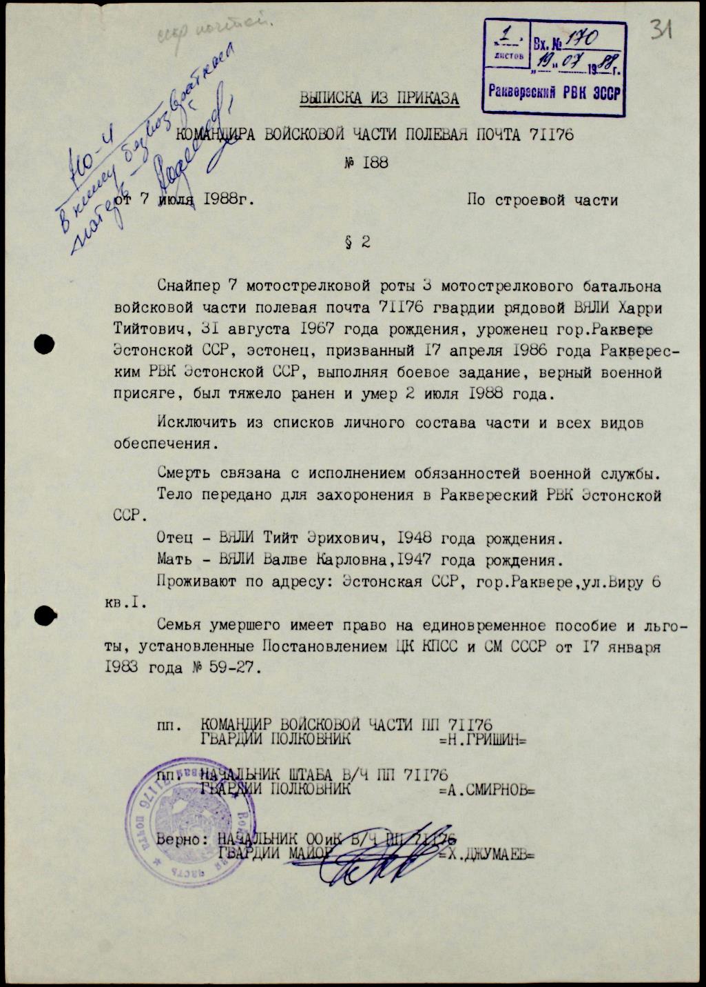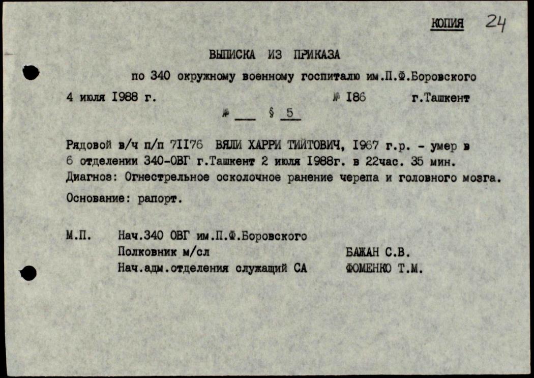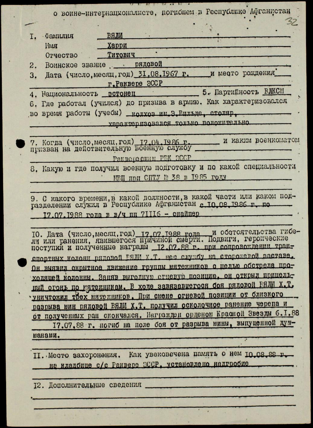 https://virumaateataja.postimees.ee/230 ... ppenud-eluLaual on põlev küünal ja pildialbum. 2. juulil 1988. aastal suri Taškendi sõjaväehaiglas Afganistanis haavata saanud Harri Väli. Teadaolevalt oli ta viimane Eestist pärit surmasaanu tolles sõjas. Oma poega meenutab ema Valve Väli.....