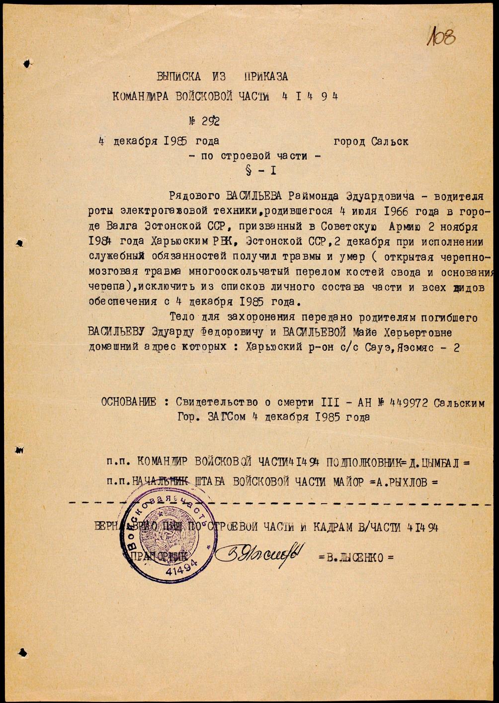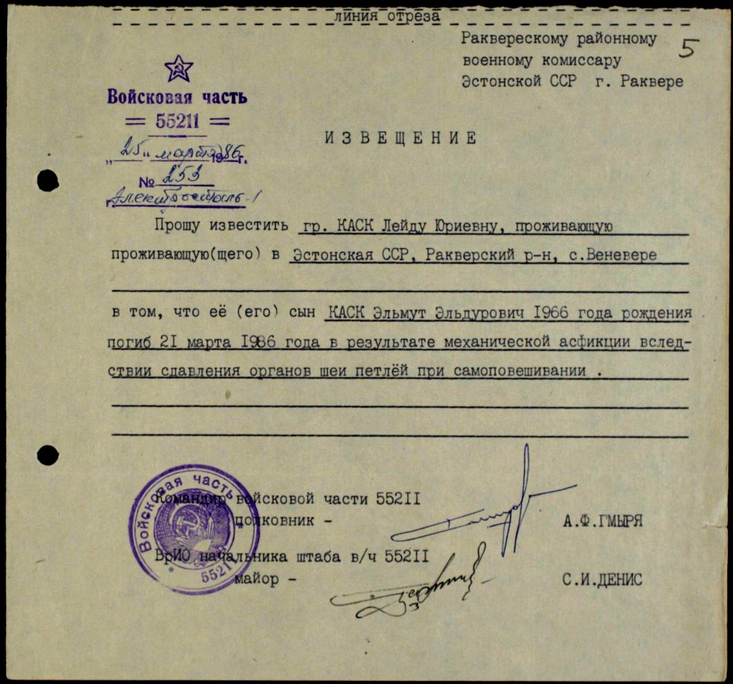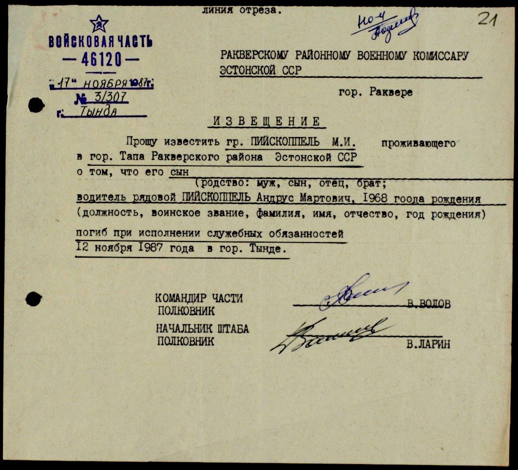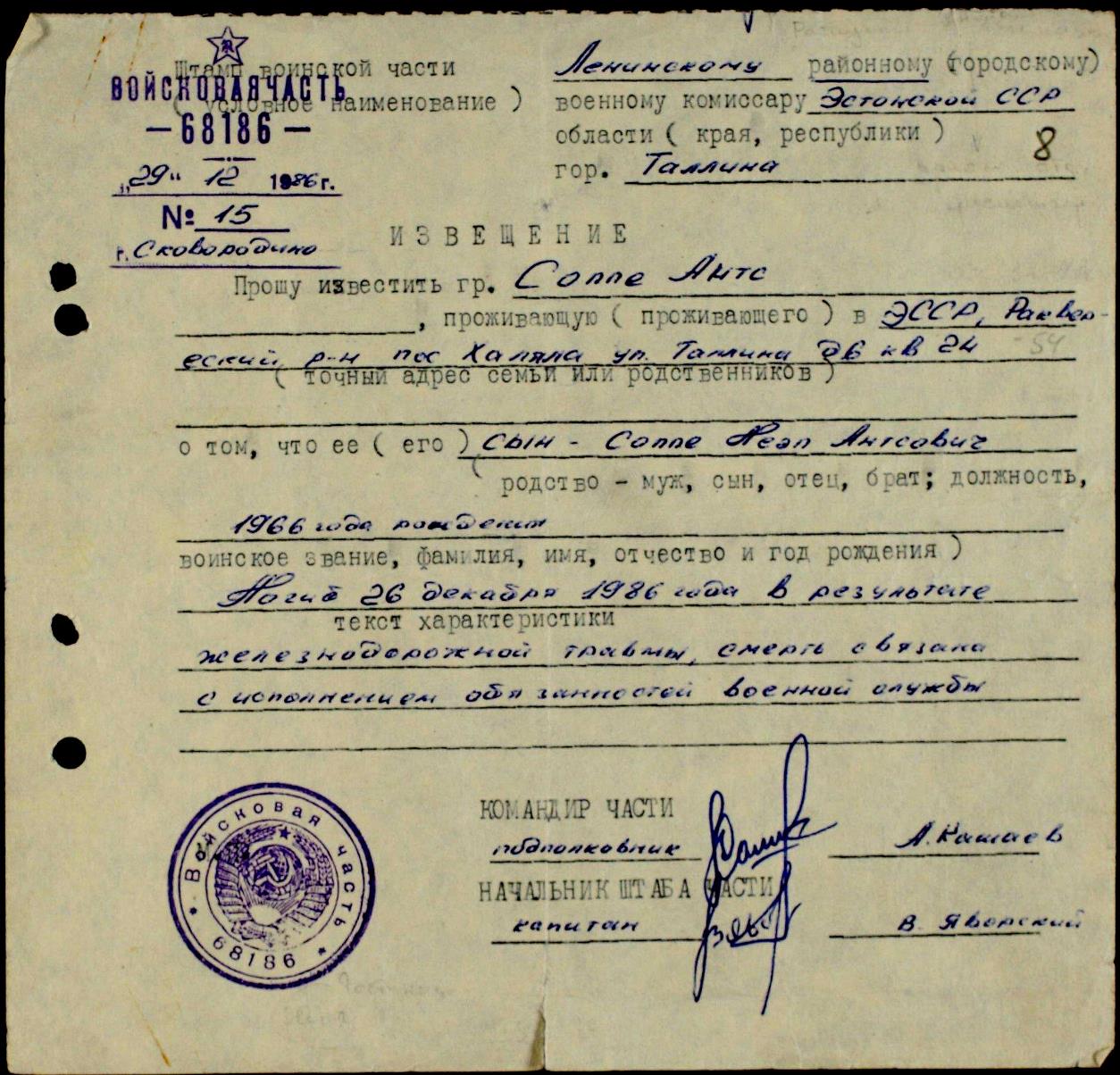 https://virumaateataja.postimees.ee/230 ... ppenud-eluLaual on põlev küünal ja pildialbum. 2. juulil 1988. aastal suri Taškendi sõjaväehaiglas Afganistanis haavata saanud Harri Väli. Teadaolevalt oli ta viimane Eestist pärit surmasaanu tolles sõjas. Oma poega meenutab ema Valve Väli.....