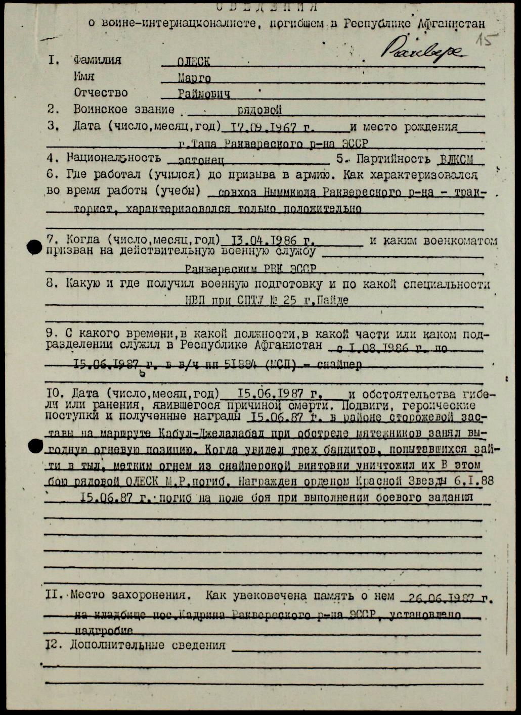 https://epl.delfi.ee/kultuur/afganistan ... d=5103053515. juunil hukkus reamees snaiper Margo Olesk, sündinud Tapal, töötas enne sõjaväeteenistust Nõmmküla sovhoosi traktoristina. Teenis kordonis, mis julgestas liikumist ühel Kabuli–Dalalabadi teelõigul. Ta märkas, et kokkupõrke ajal üritasid kolm mudahiidi tungida märkamatult seljatagant kordonisse, ning langes nende peatamise katsel. Margo Olesk on maetud Kadrinasse.