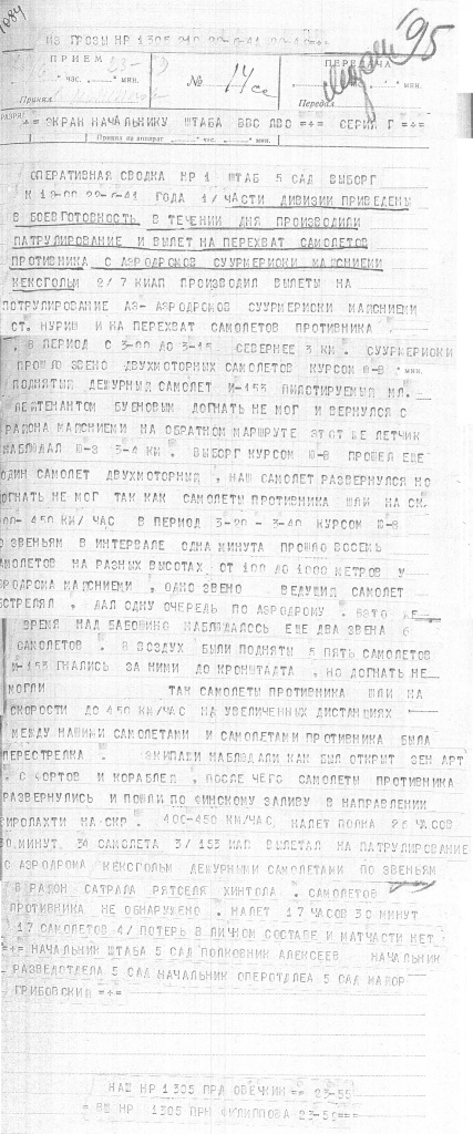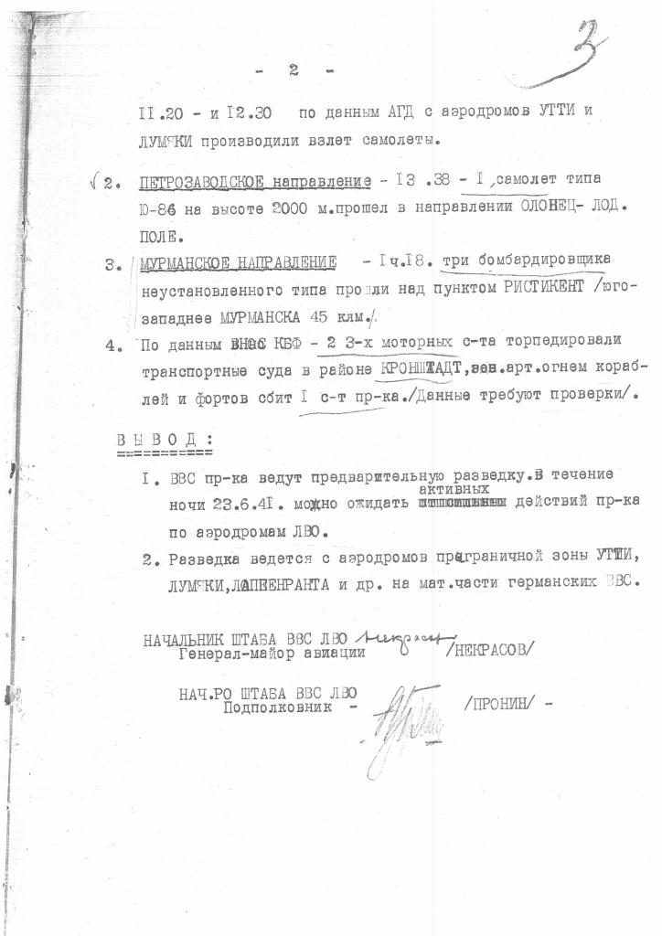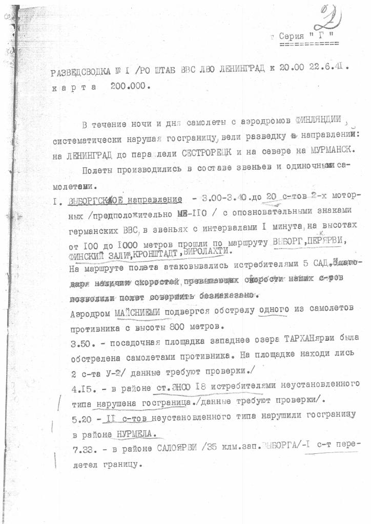 1) Põhjarinde staabi operatiivteate nr 01, millele on alla kirjutanud kindralmajor Nikišev 22.juunil 1941 kell 22.00, pikkus on kolm masinakirjalehekülge. Mingeid meenutusi vaenlase lennuväe rünnakutest rindestaabi teatises pole.