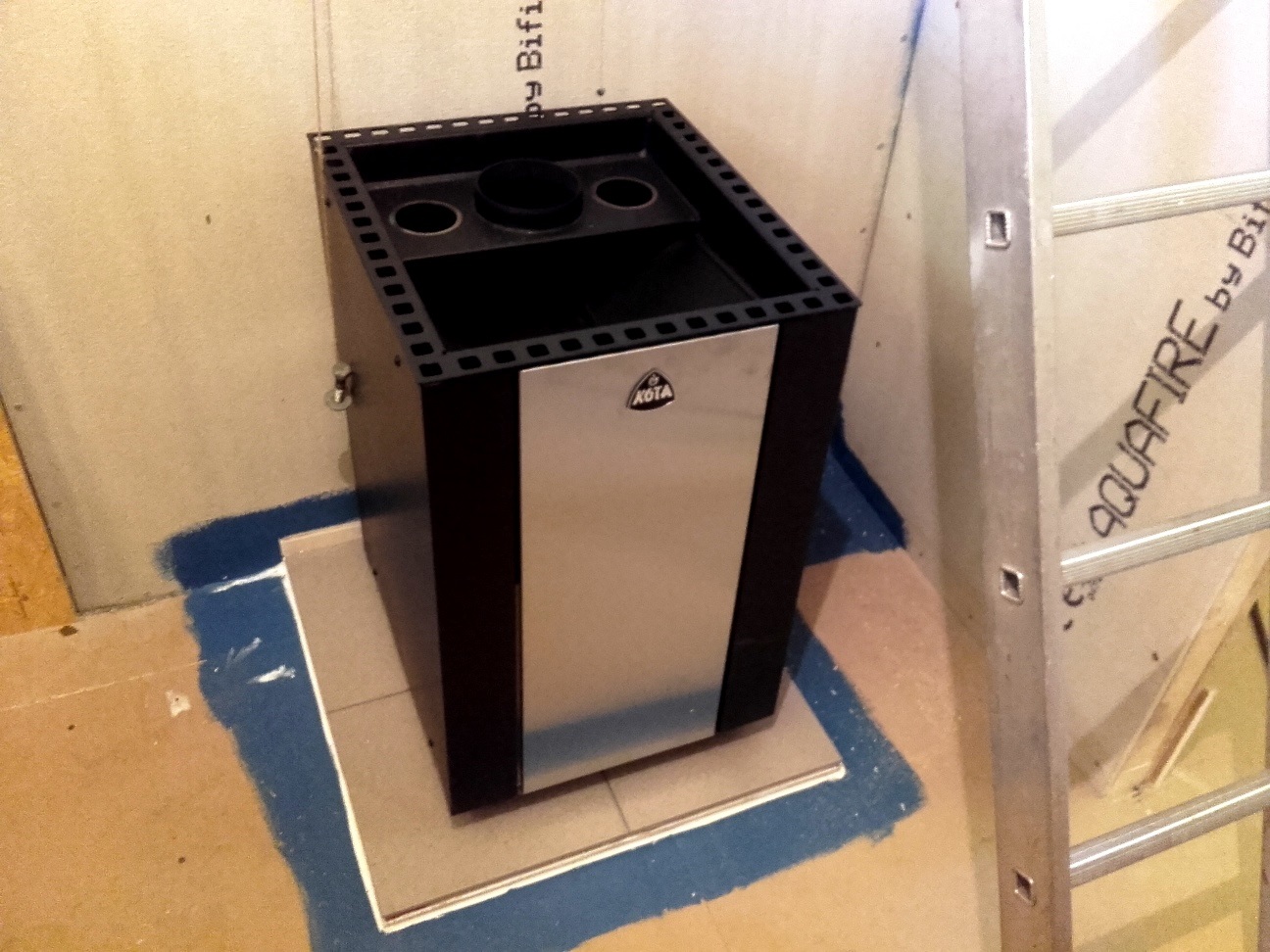 _OSB-ga kaetud põrand töödeldud niiskustõkkega(sinine) 2x ning seinad kuni15 cm kõrguselt, tehtud vee väljajooksu ava(vesi voolab saunamaja alla) keset pesu- ja leiliruumi põrandat, tehtud kalded äravoolule ning kaetud keraamiliste plaatidega 10x10 cm ning vuugitud